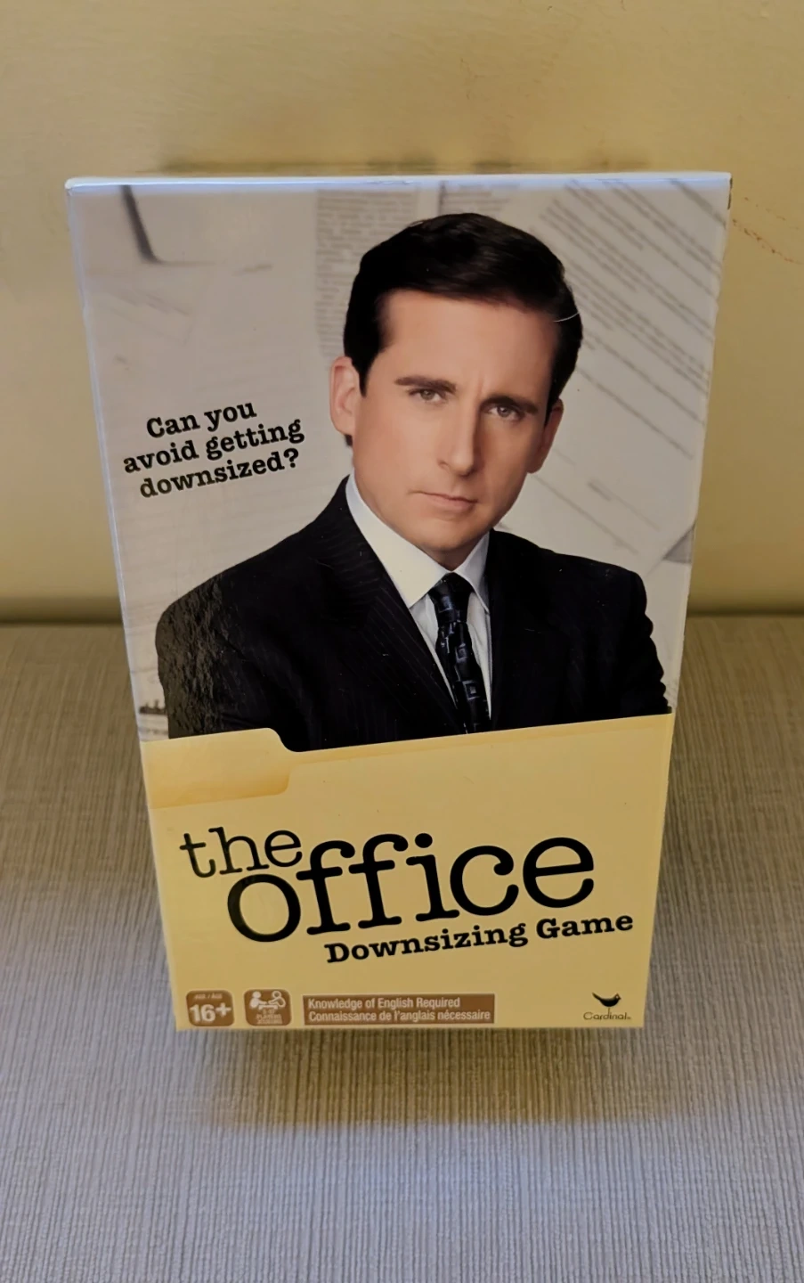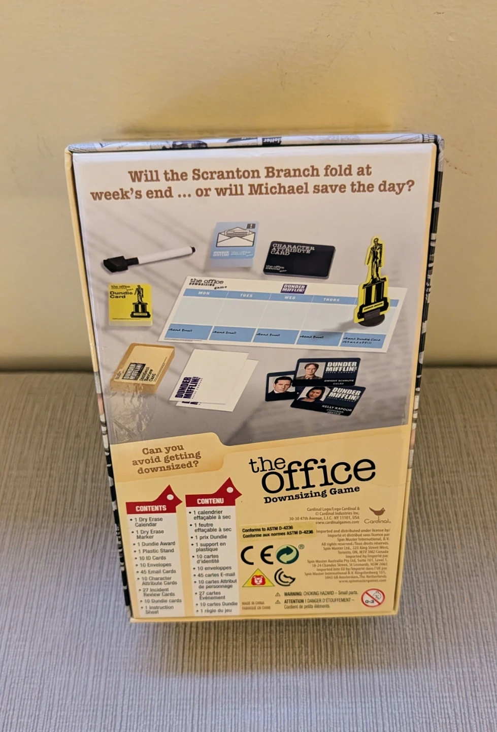 This is The Office Downsizing Game, designed for ages 16 and up. It includes a calendar, dry erase marker, 1 Dunder Mifflin Award, 1 Rule Book, 10 Bundle Cards, 40 Email Cards, 10 envelopes, and 10 player attribute cards. It's a fun game for fans of The Office!