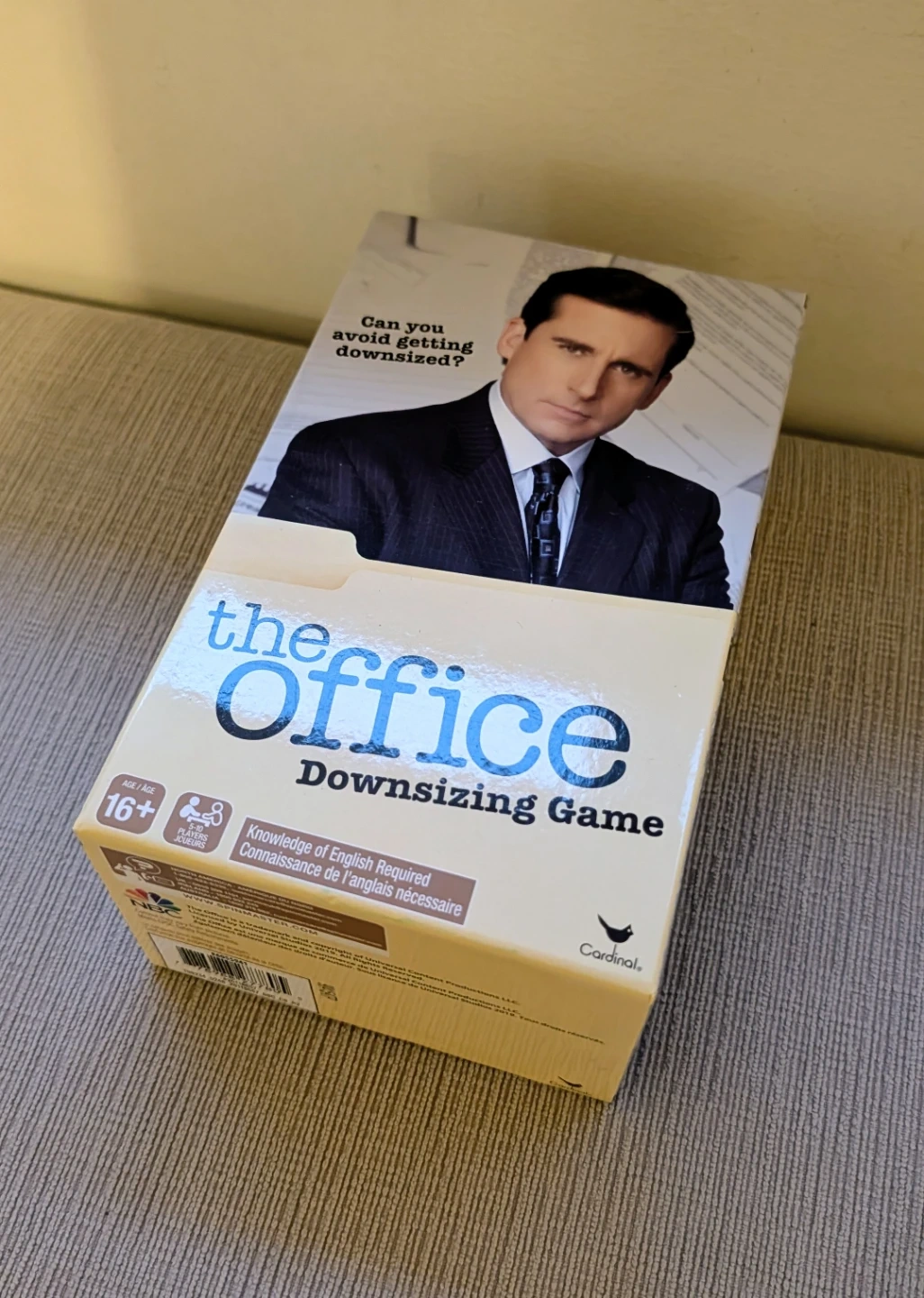 This is The Office Downsizing Game, designed for ages 16 and up. It includes a calendar, dry erase marker, 1 Dunder Mifflin Award, 1 Rule Book, 10 Bundle Cards, 40 Email Cards, 10 envelopes, and 10 player attribute cards. It's a fun game for fans of The Office!
