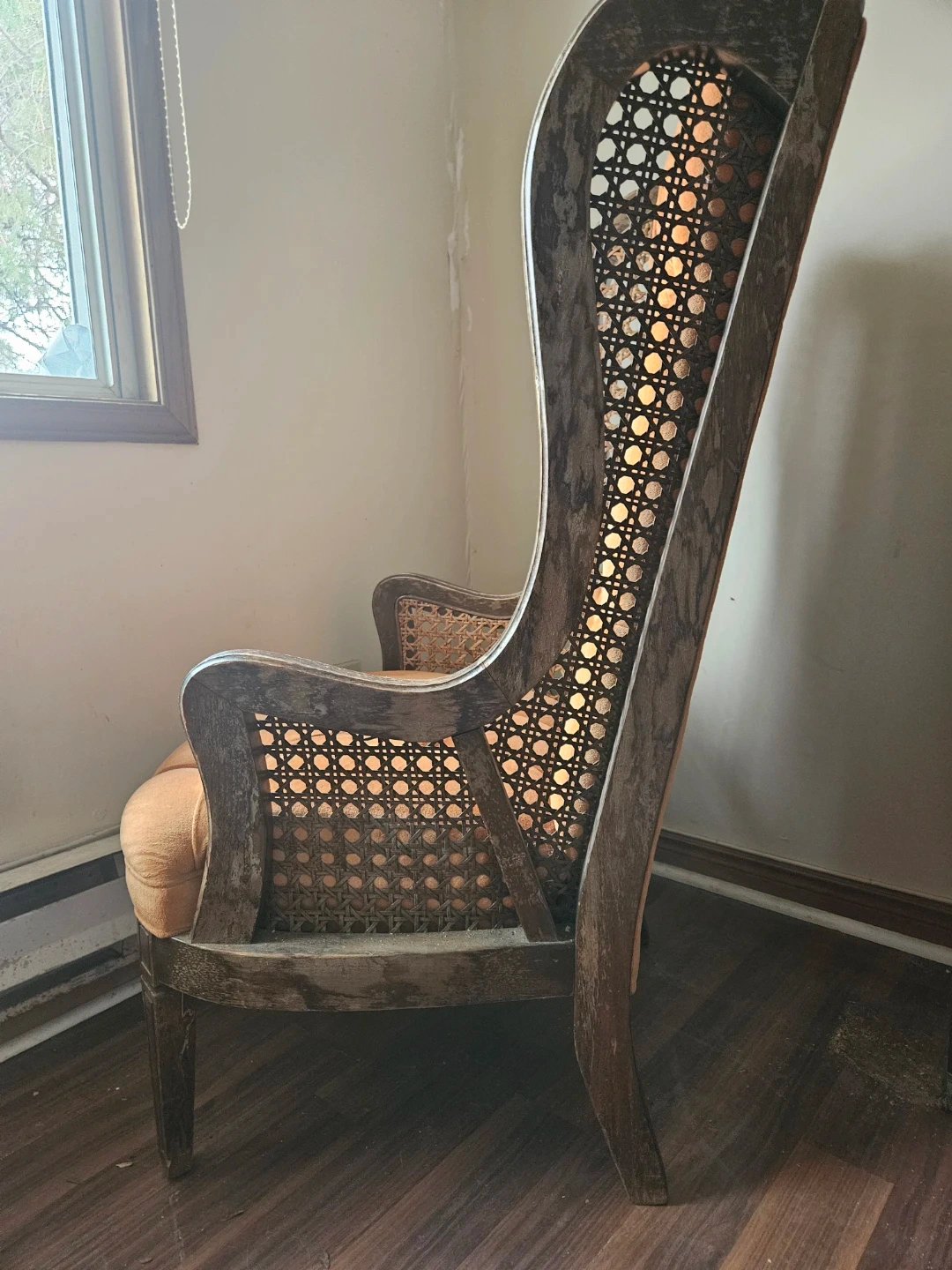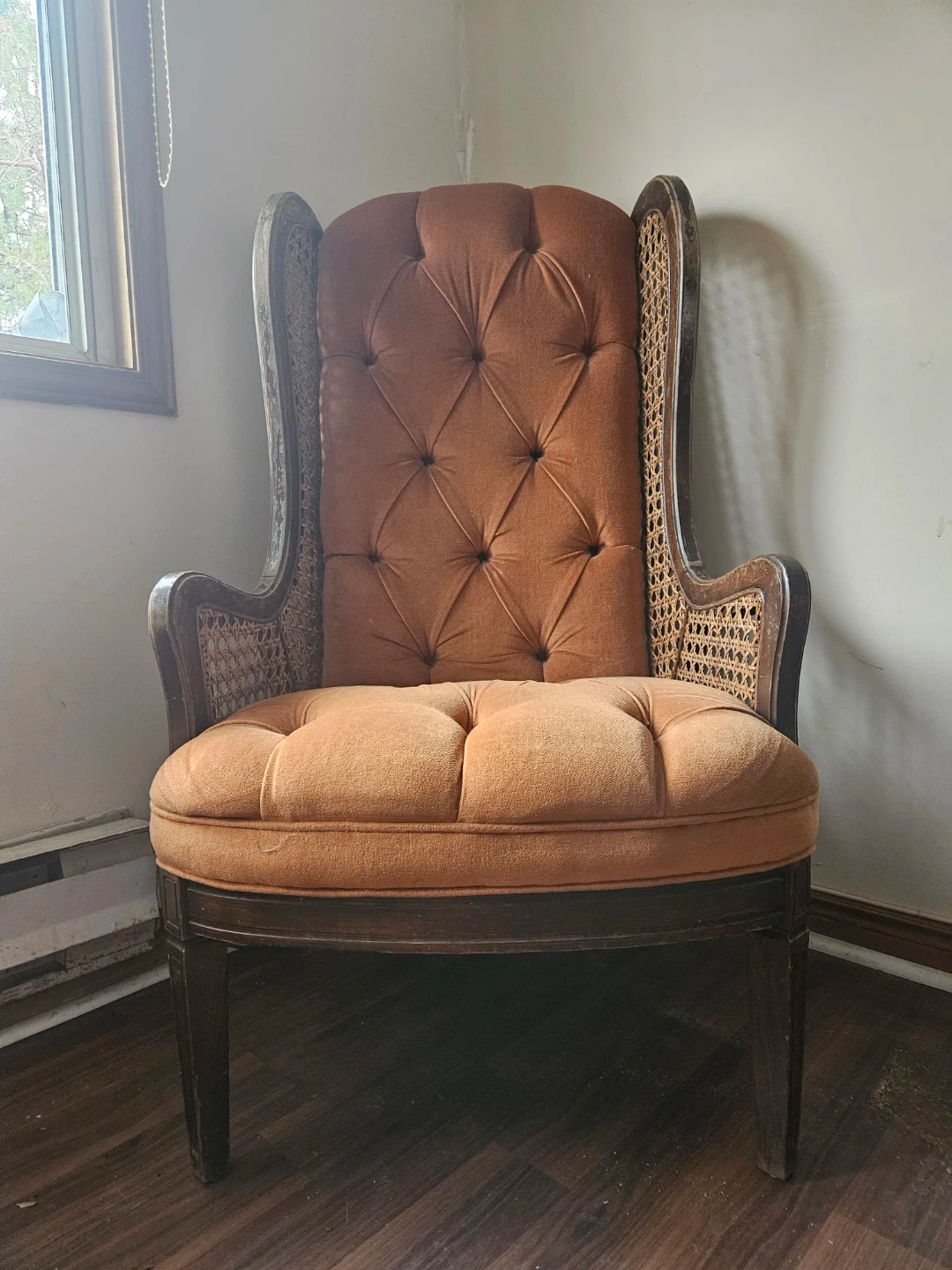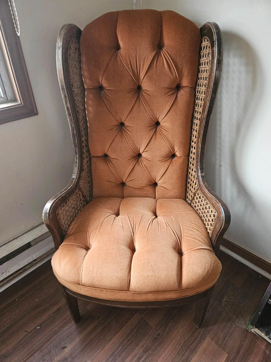 Looking to add a touch of vintage charm to your home? This wingback accent chair could be just the thing! It features a unique design with a tufted back and woven wicker detailing. The chair is in great condition and ready to be enjoyed in your living room, bedroom, or reading nook