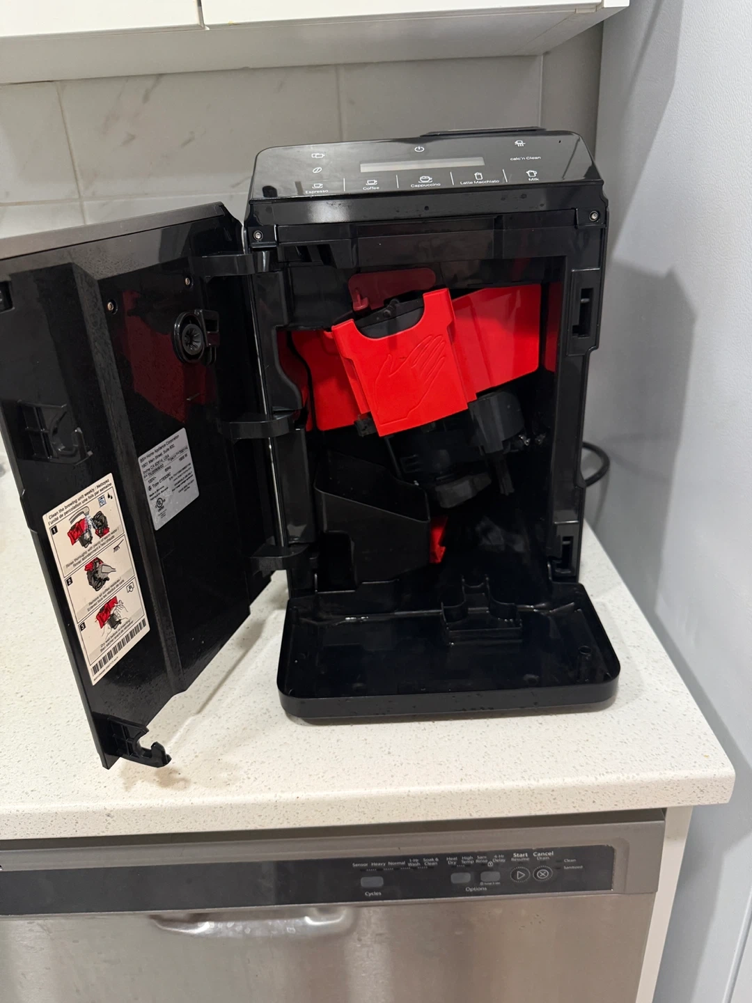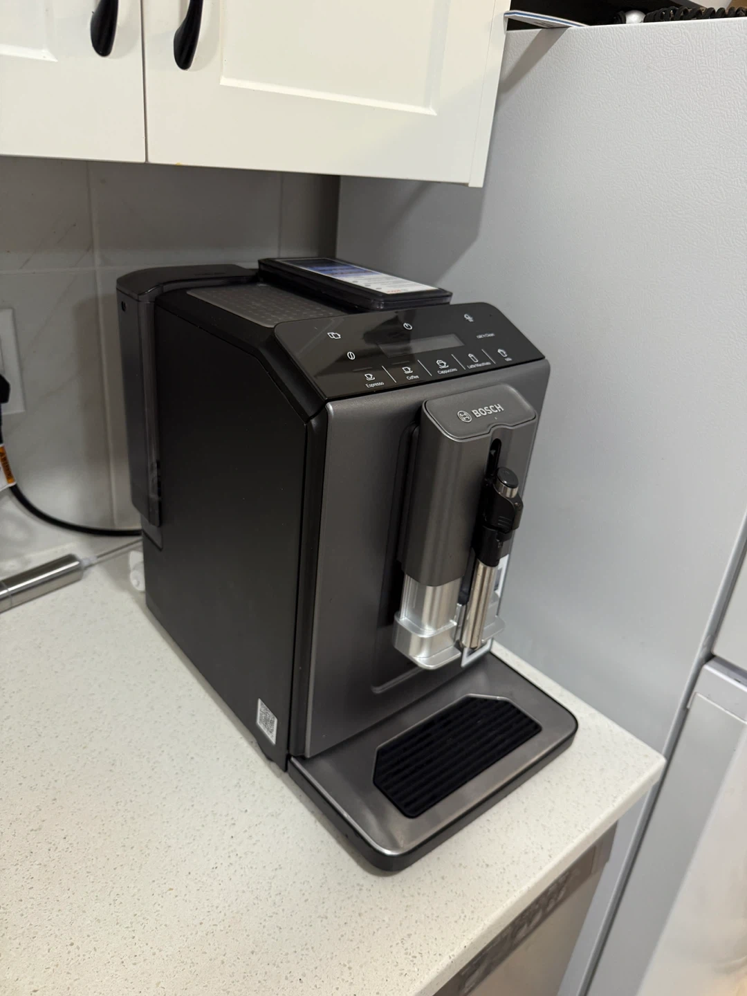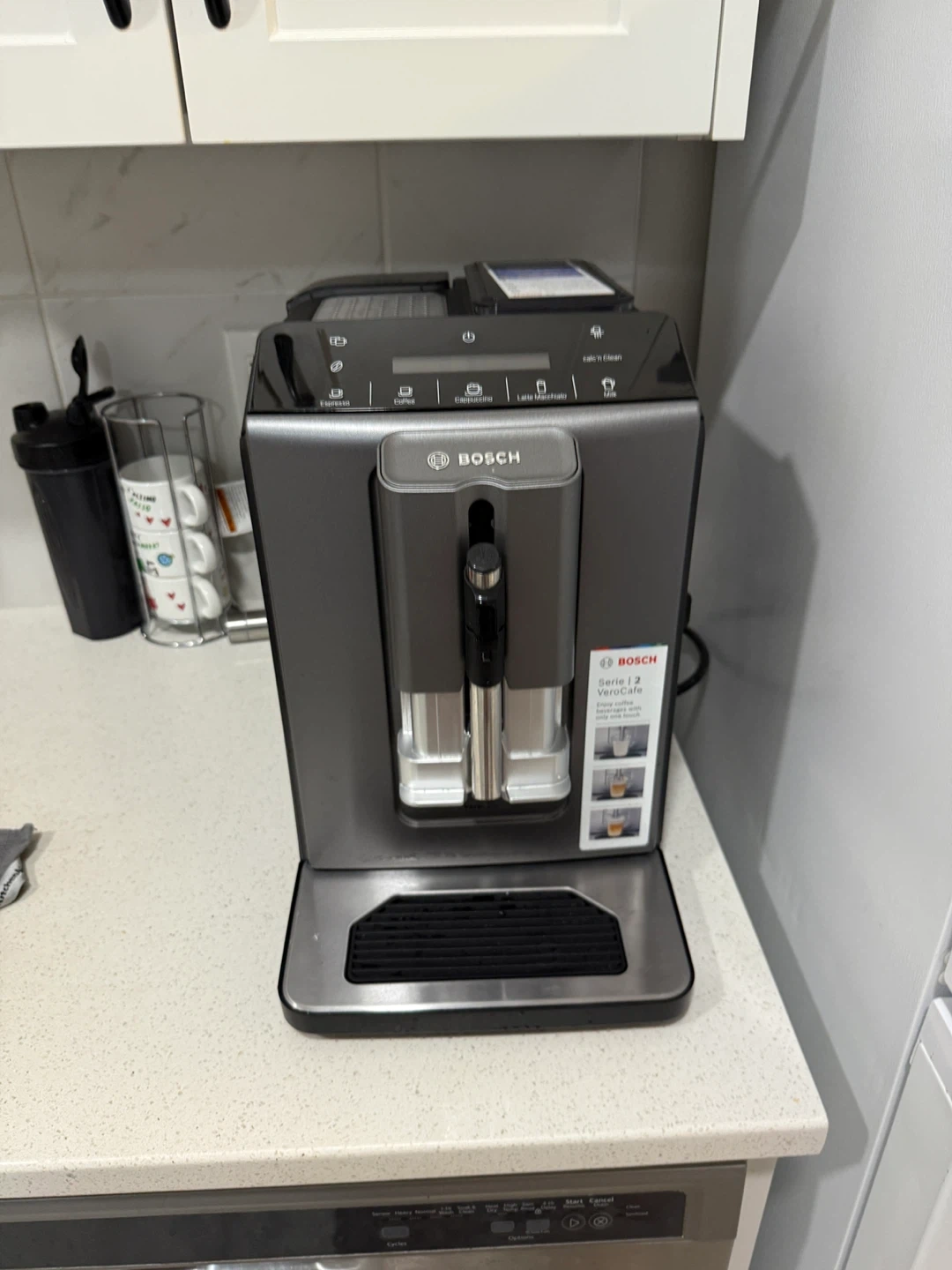 This Bosch coffee machine makes espresso, cappuccino, and latte drinks. It's a compact unit perfect for any kitchen counter. Uses coffee beans and has a built-in grinder.