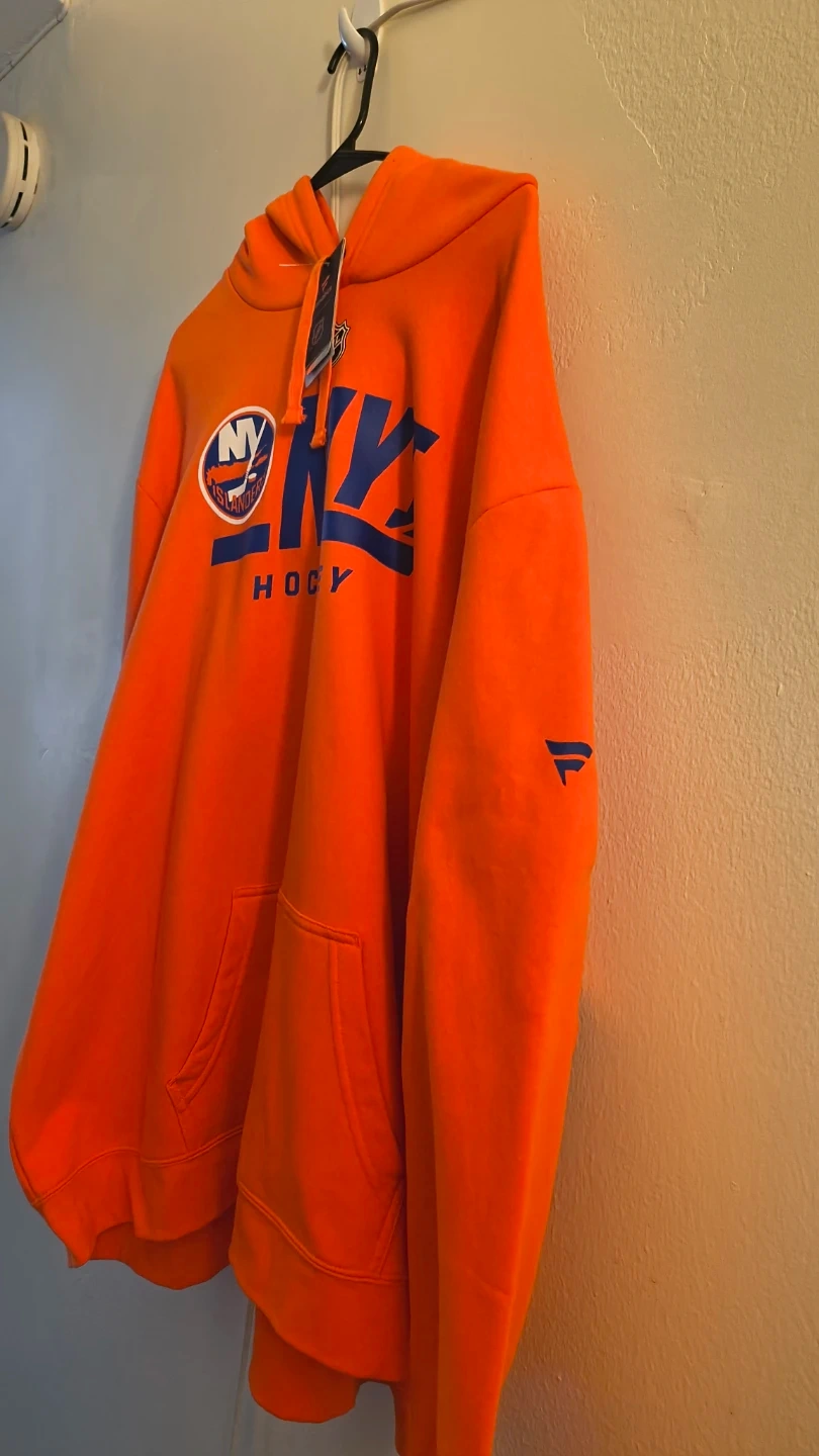 This orange Fanatics hoodie features the NY Islanders logo and 'Hockey' text. It's made of a soft material and has a front pouch pocket. Perfect for any hockey fan!