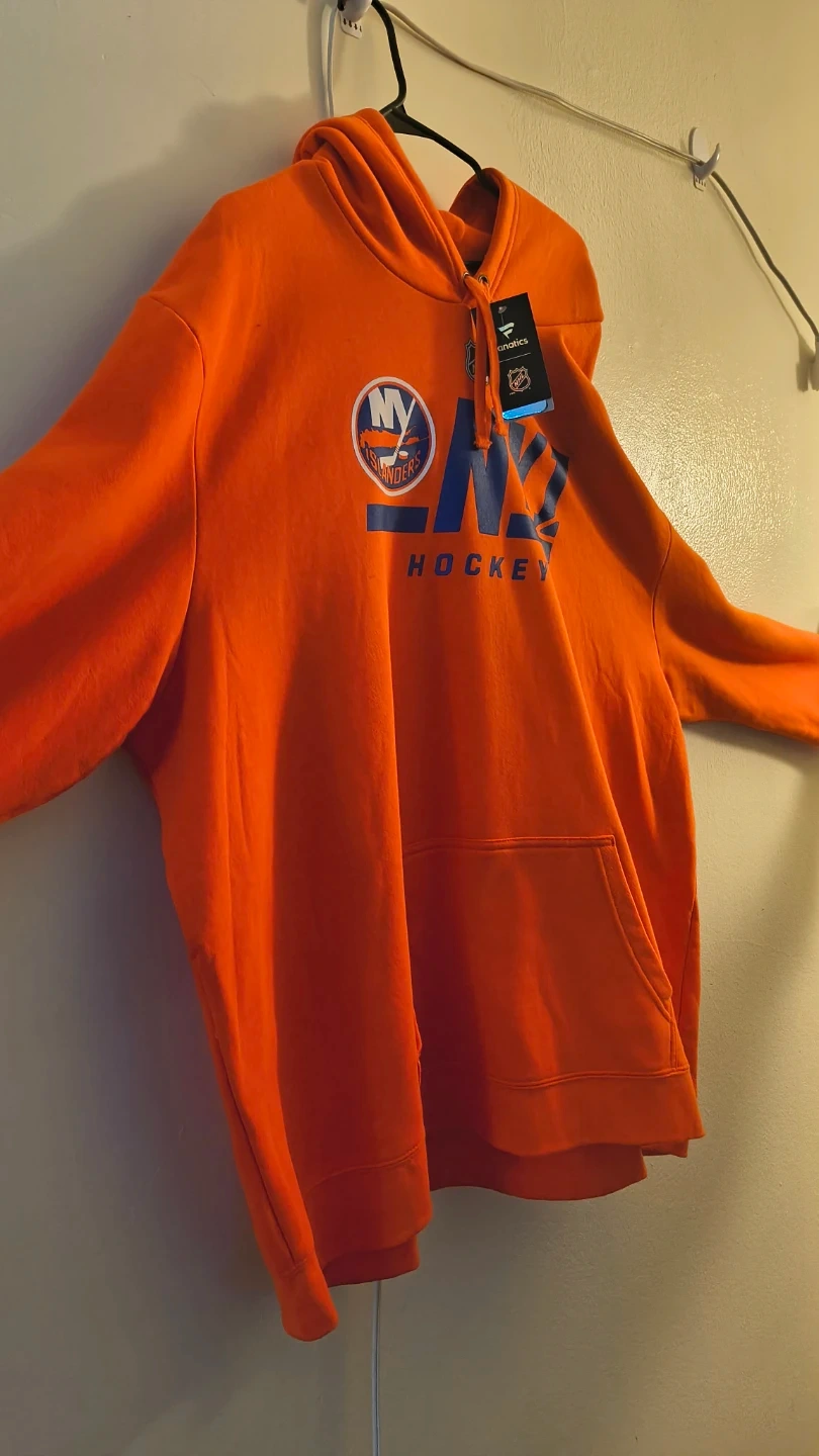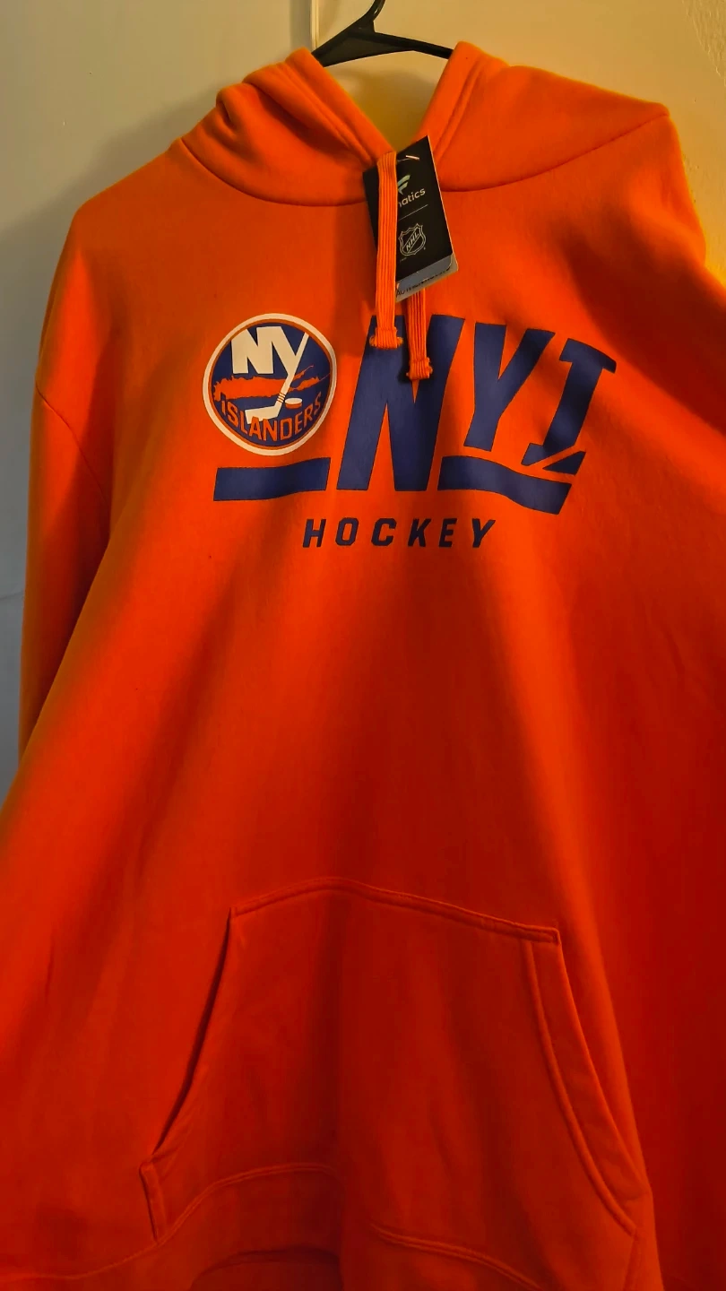 This orange Fanatics hoodie features the NY Islanders logo and 'Hockey' text. It's made of a soft material and has a front pouch pocket. Perfect for any hockey fan!