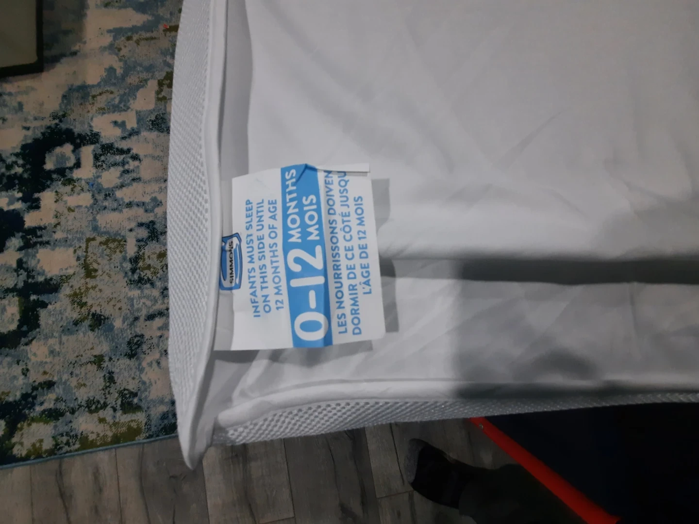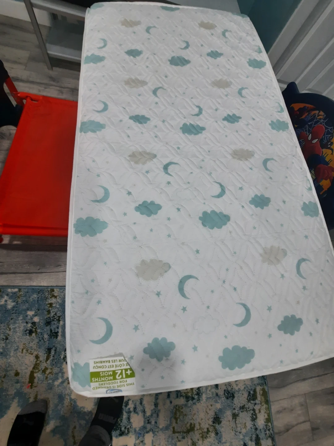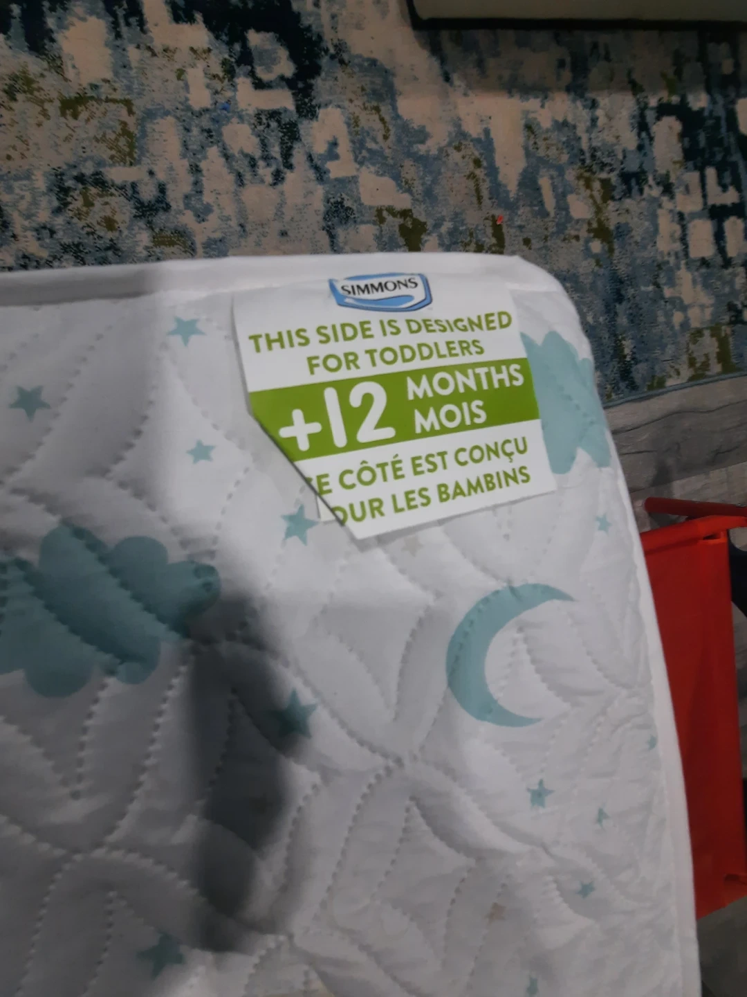 Here's a Simmons Kids mattress designed for infants from 0-12 months on one side and toddlers +12 months on the other! The mattress has a cute pattern with moons and clouds