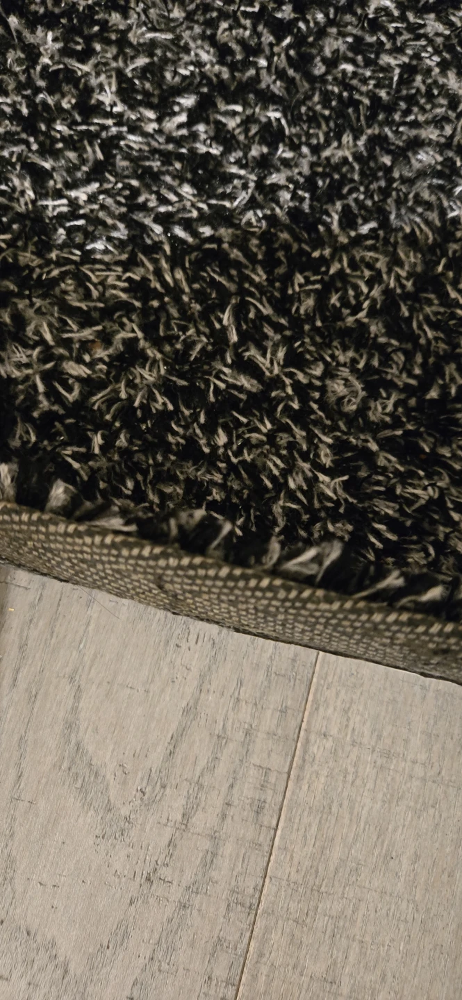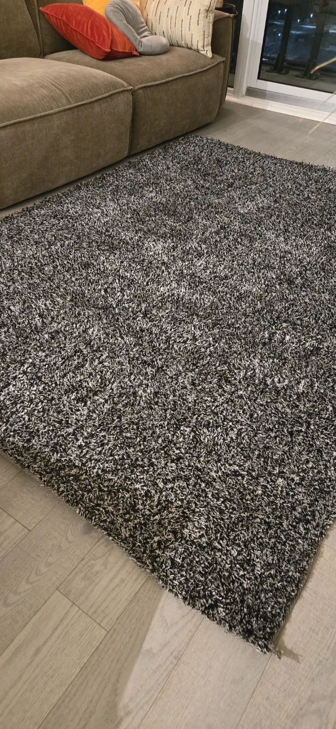 This shaggy area rug offers a plush feel and a modern black and white speckled design. Its generous size makes it a cozy addition to any living space. Provides warmth and comfort underfoot.