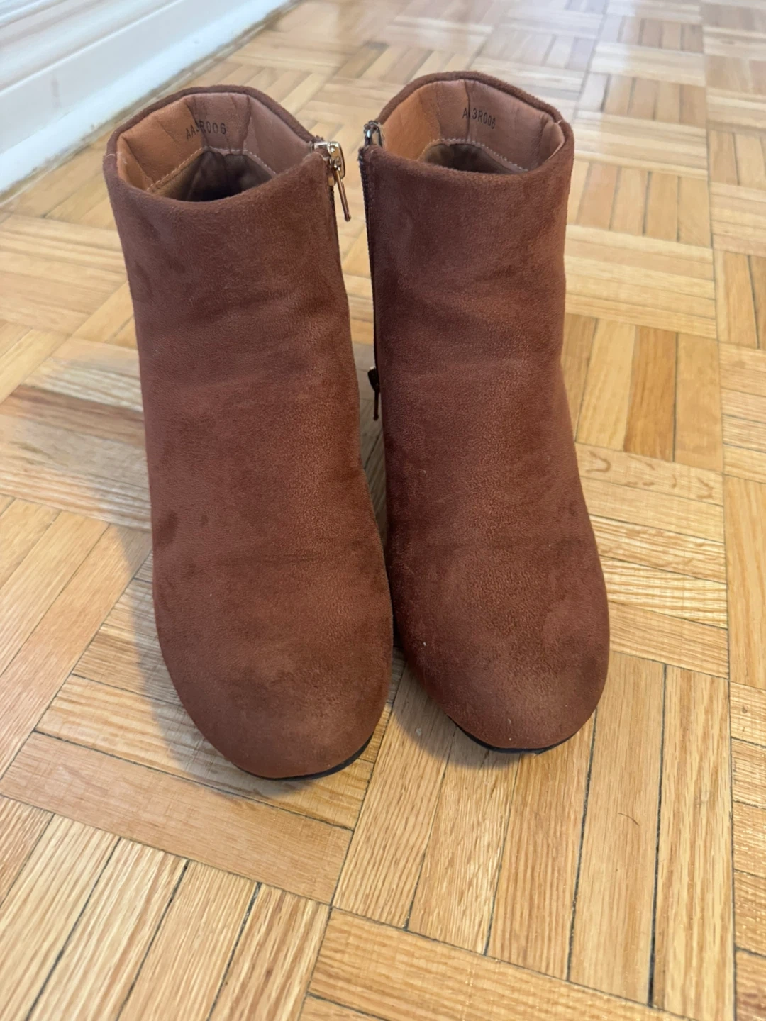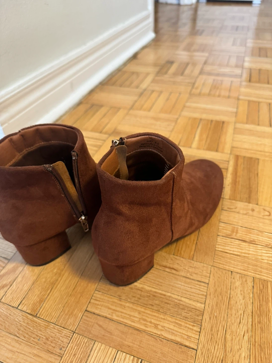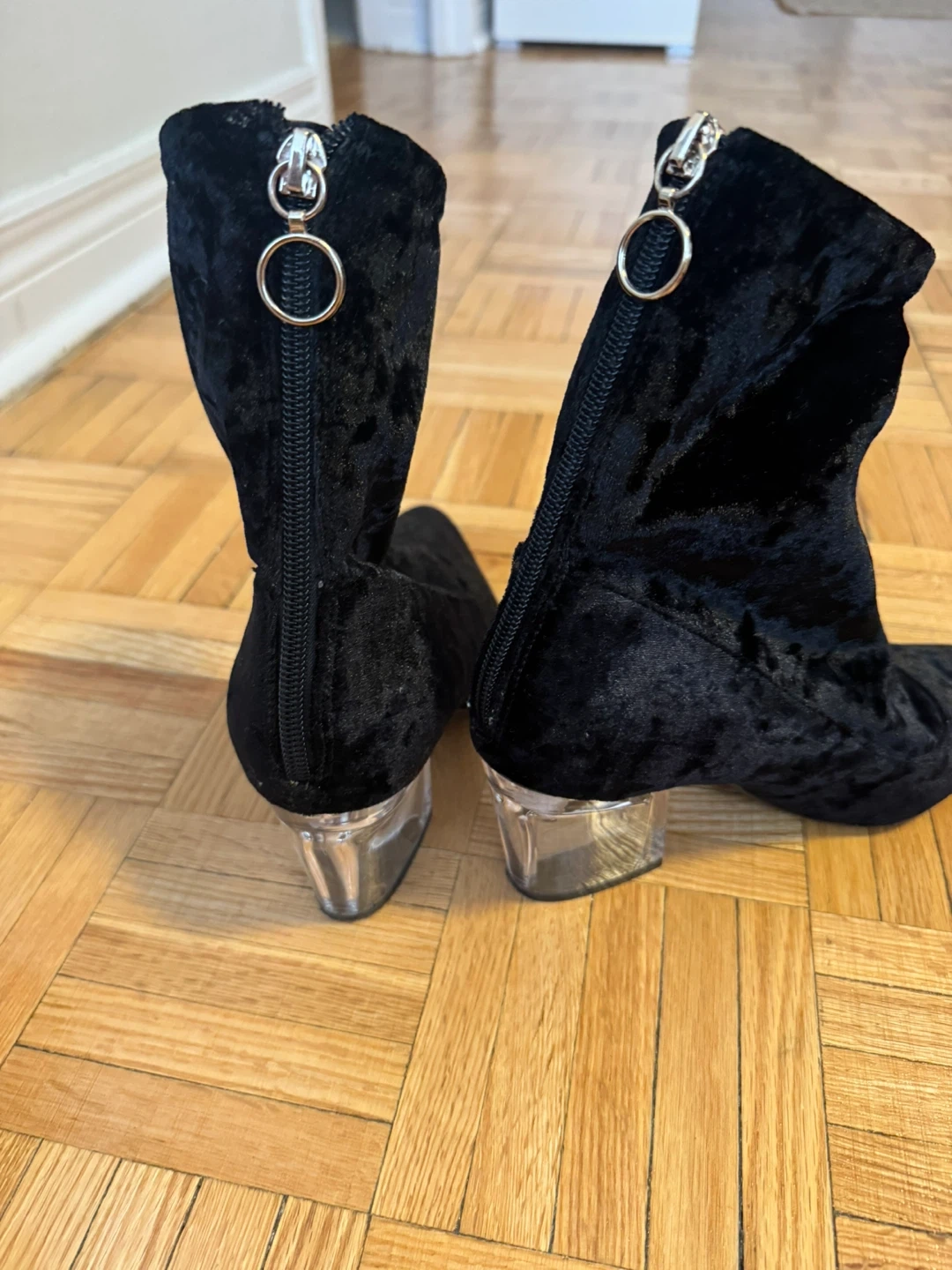 Chic black velvet ankle boots featuring a pointed toe and clear block heels. They have a convenient back zipper closure. These boots are a statement piece for any outfit!