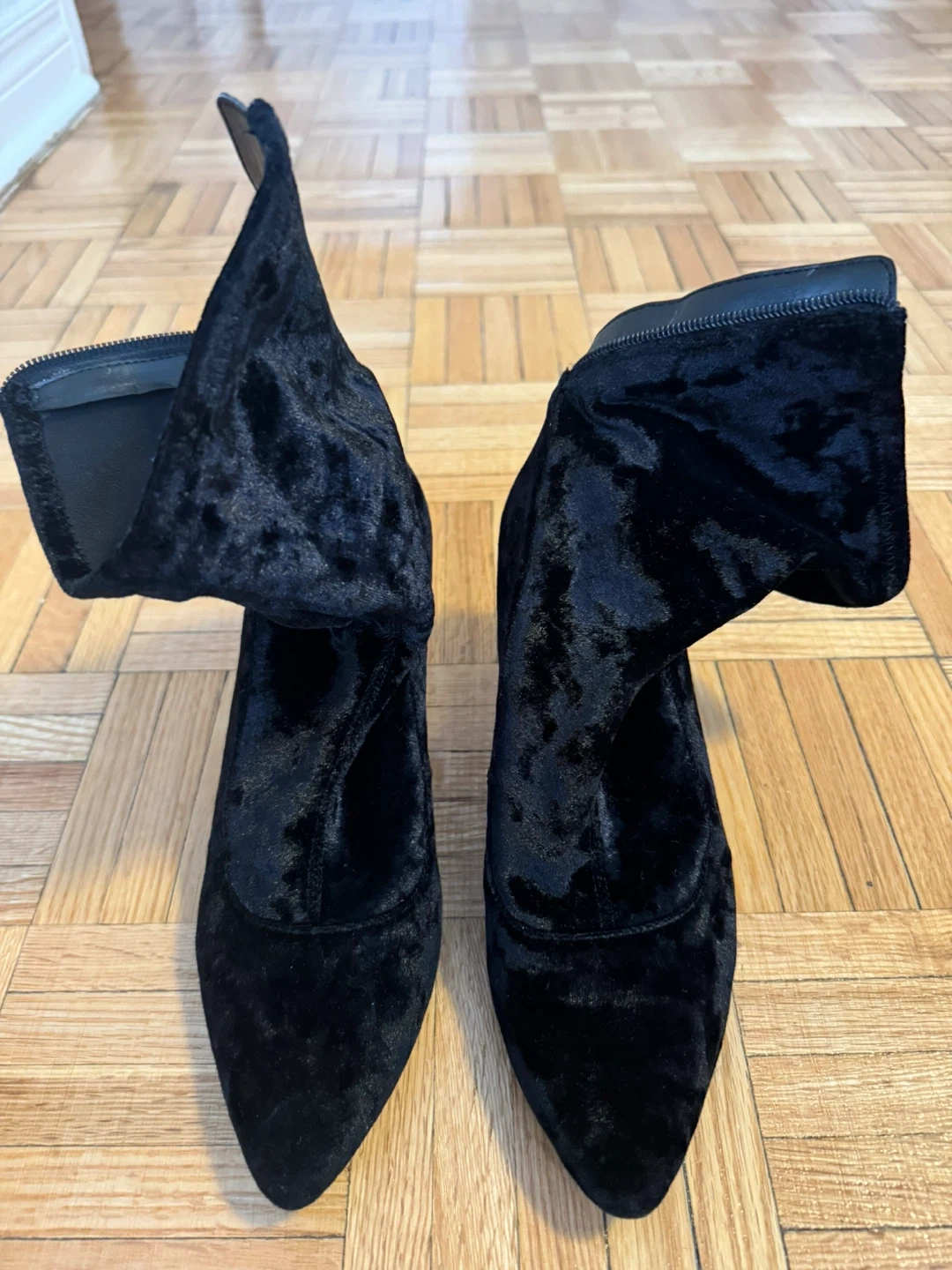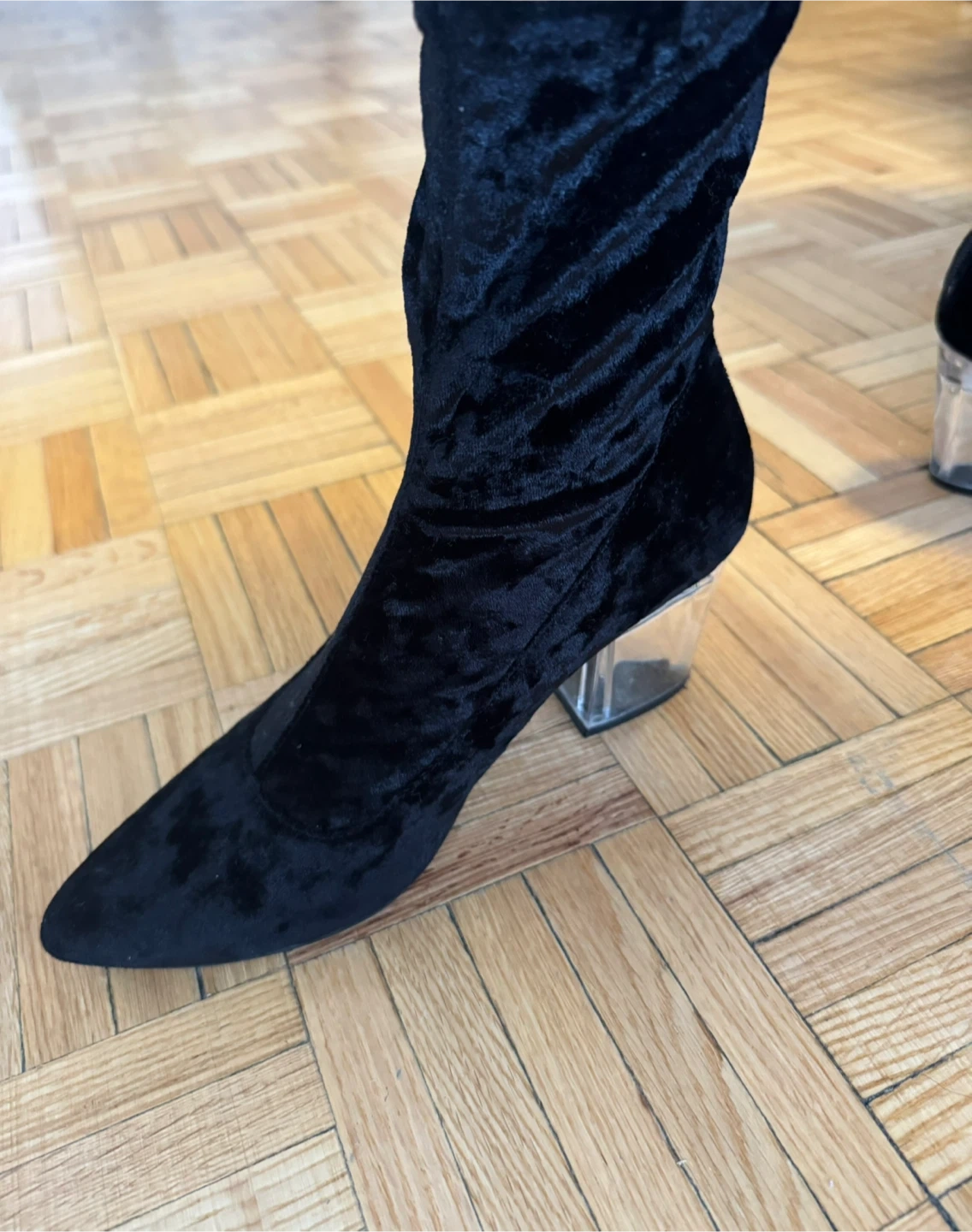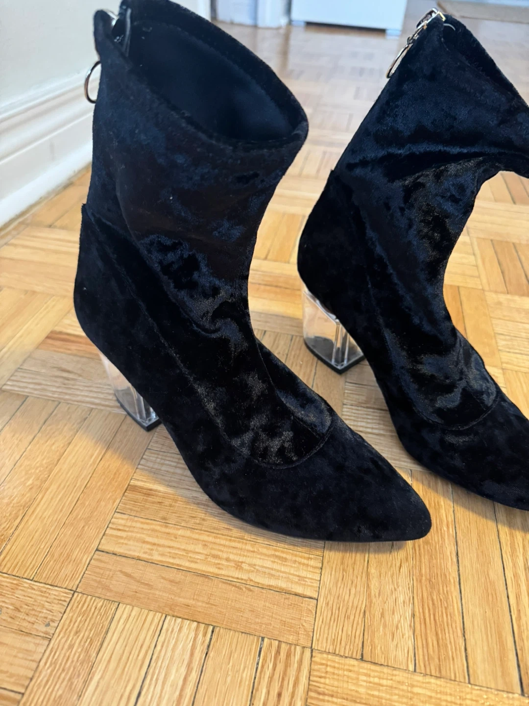 Chic black velvet ankle boots featuring a pointed toe and clear block heels. They have a convenient back zipper closure. These boots are a statement piece for any outfit!