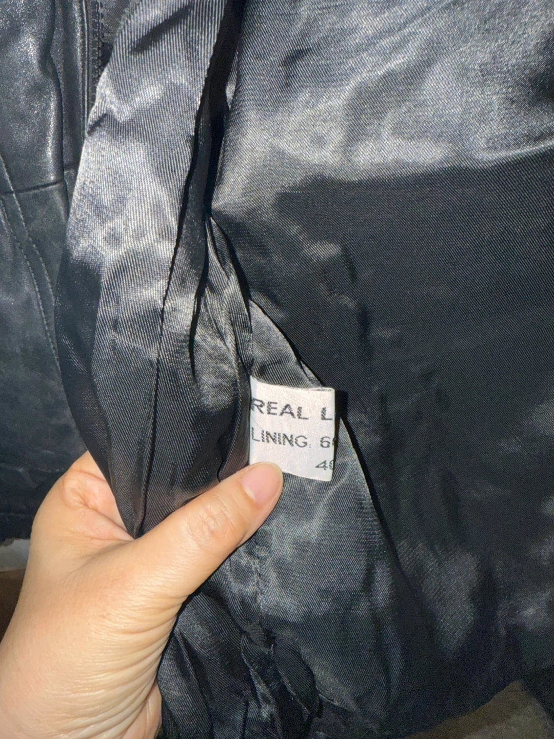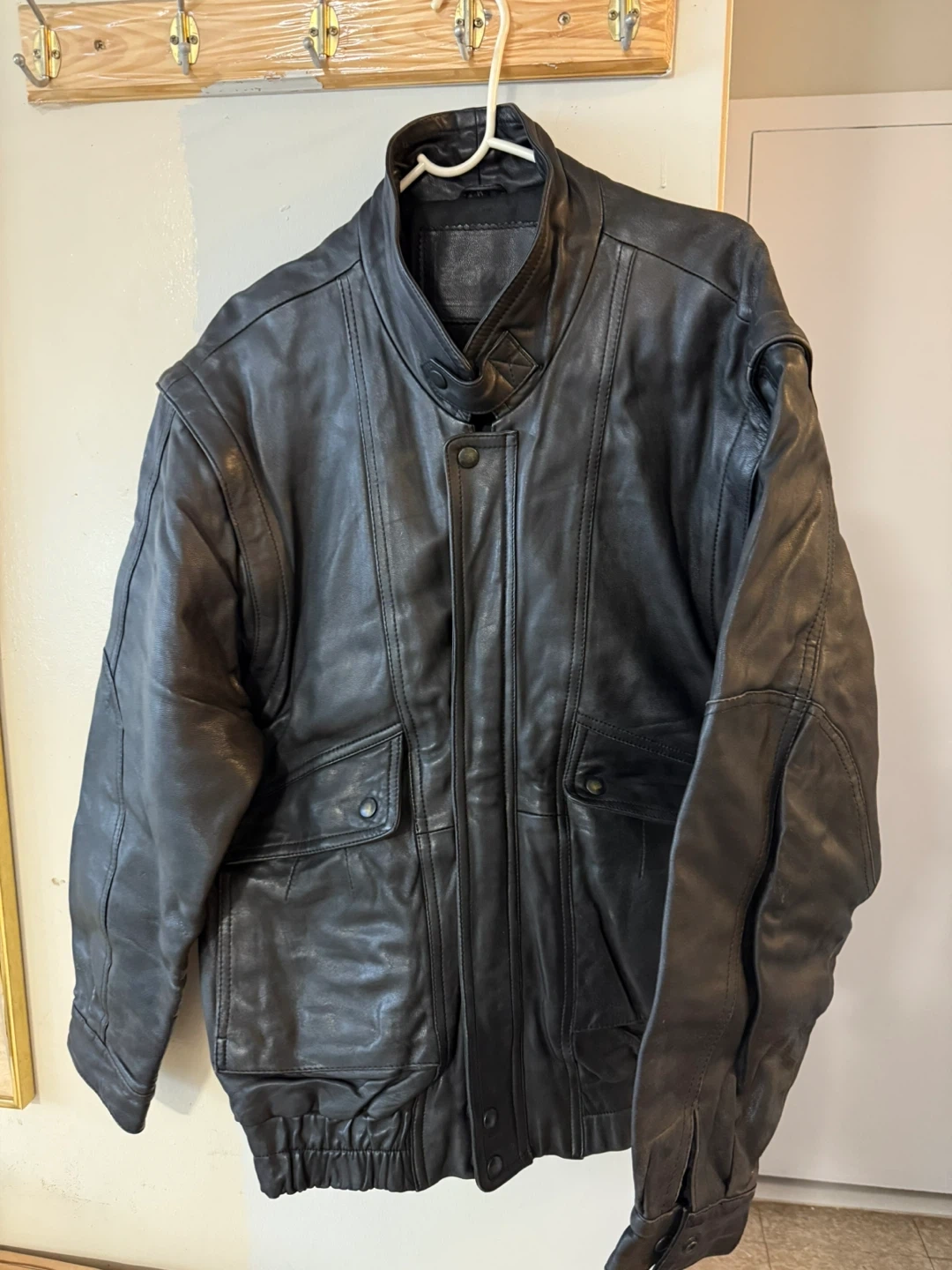 Here's a classic black leather jacket! It's a timeless piece that would look great in anyone's closet. It's in good condition and ready for a new owner. The sleeves can be removed.