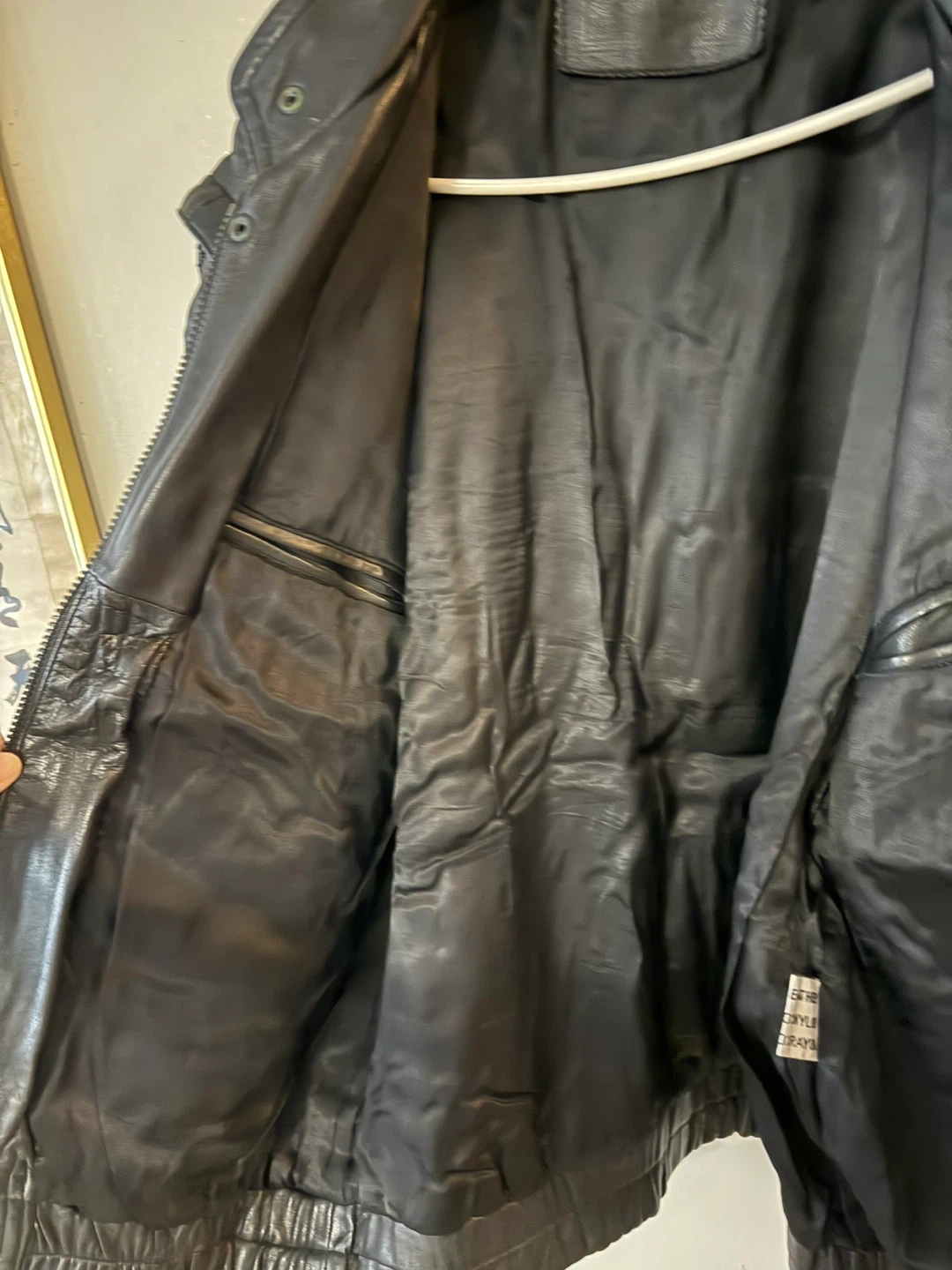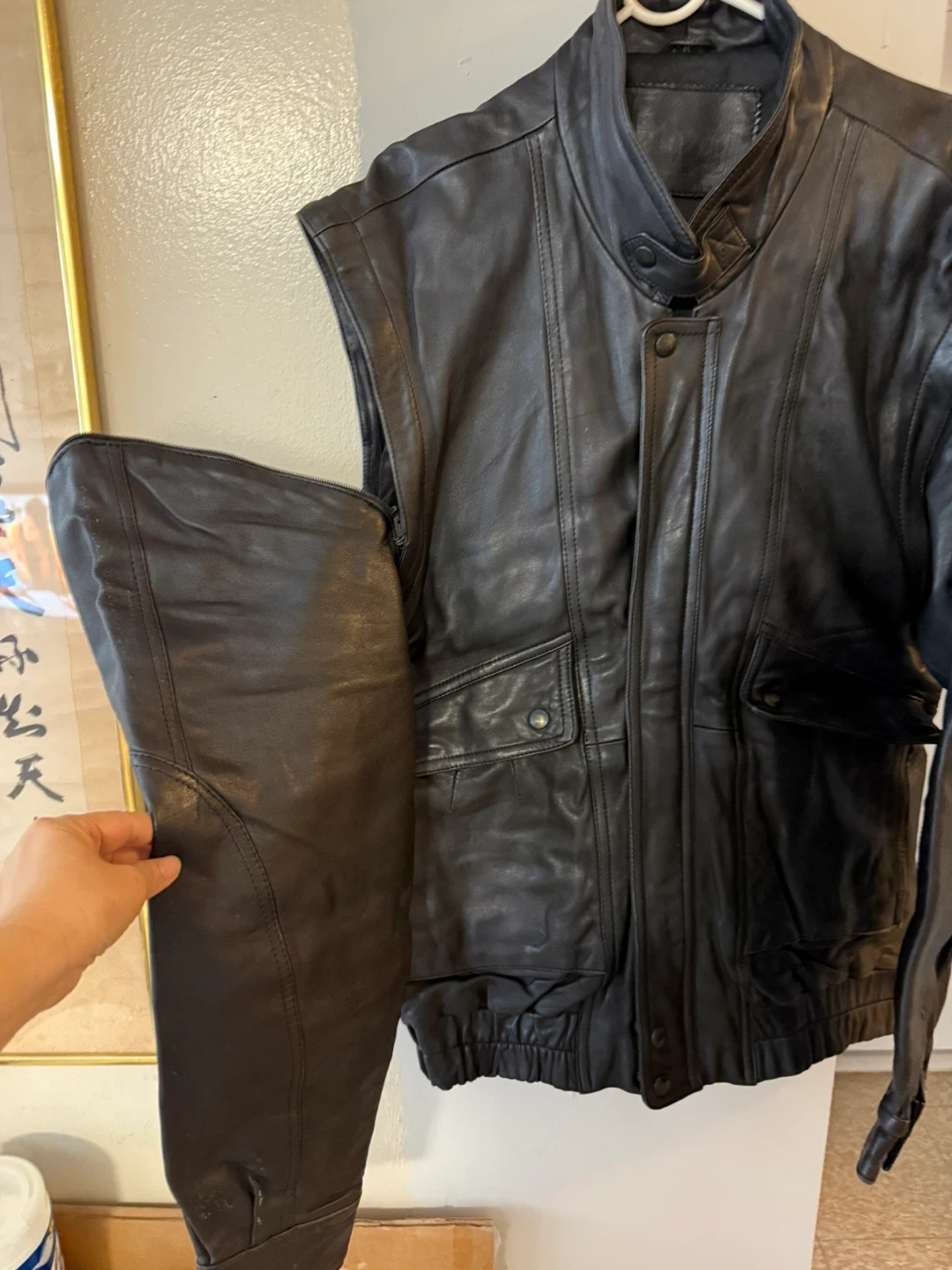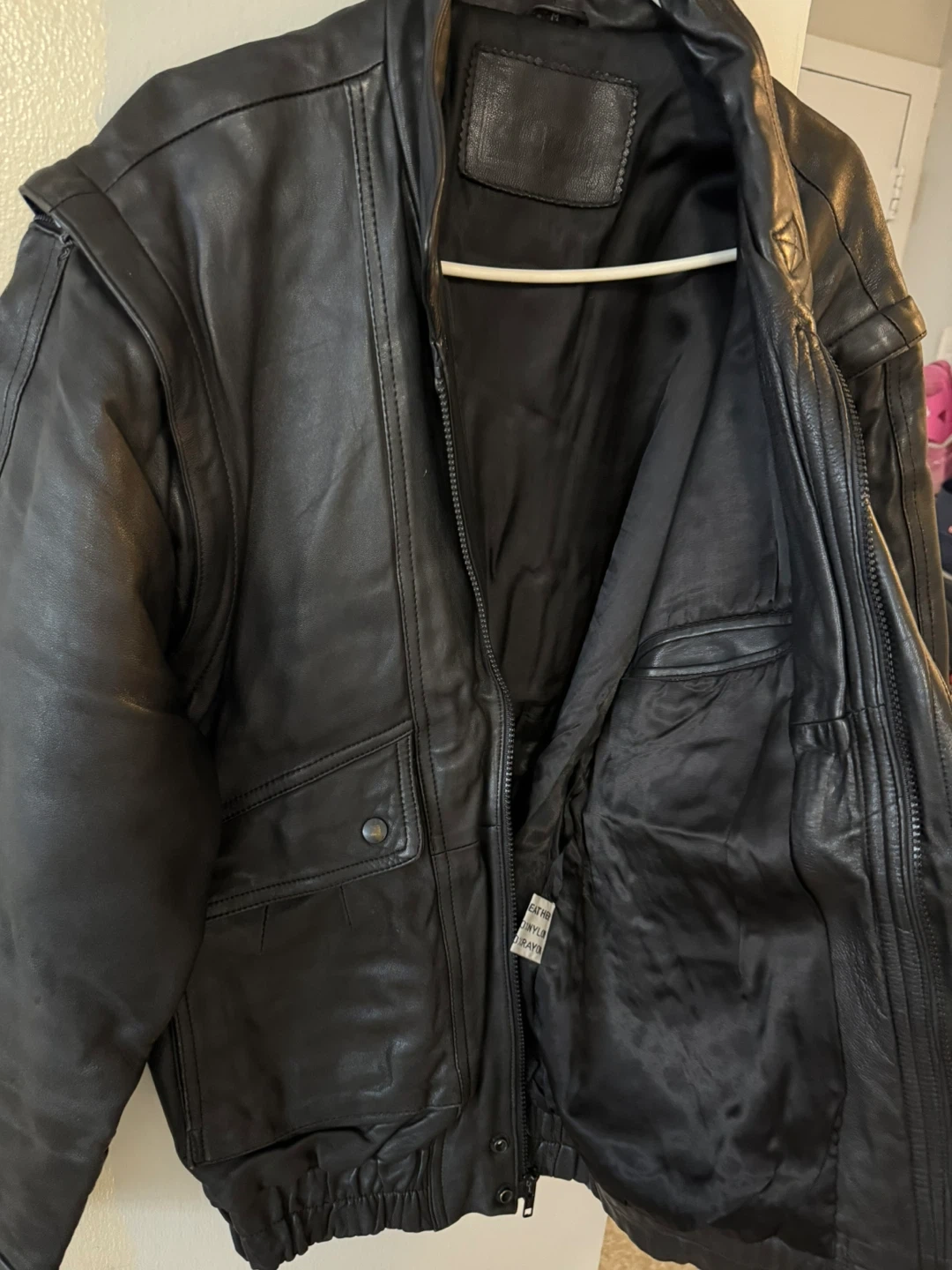 Here's a classic black leather jacket! It's a timeless piece that would look great in anyone's closet. It's in good condition and ready for a new owner. The sleeves can be removed.