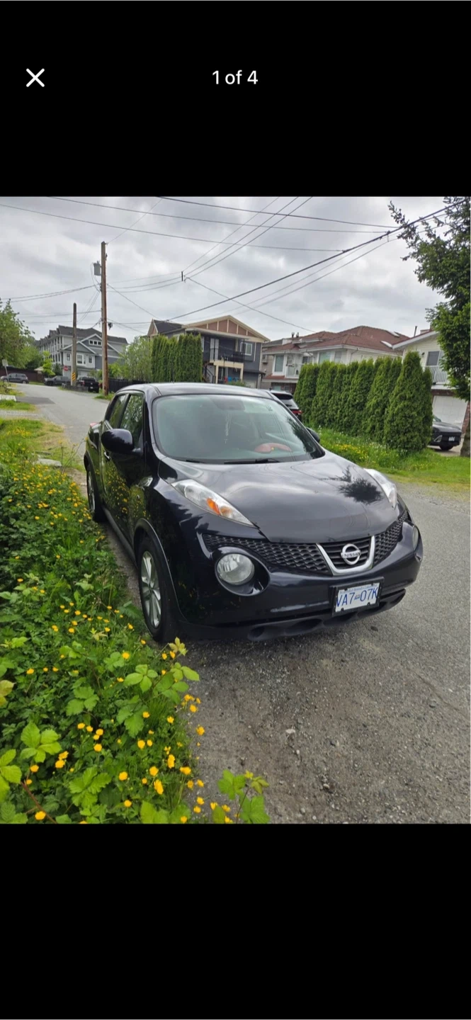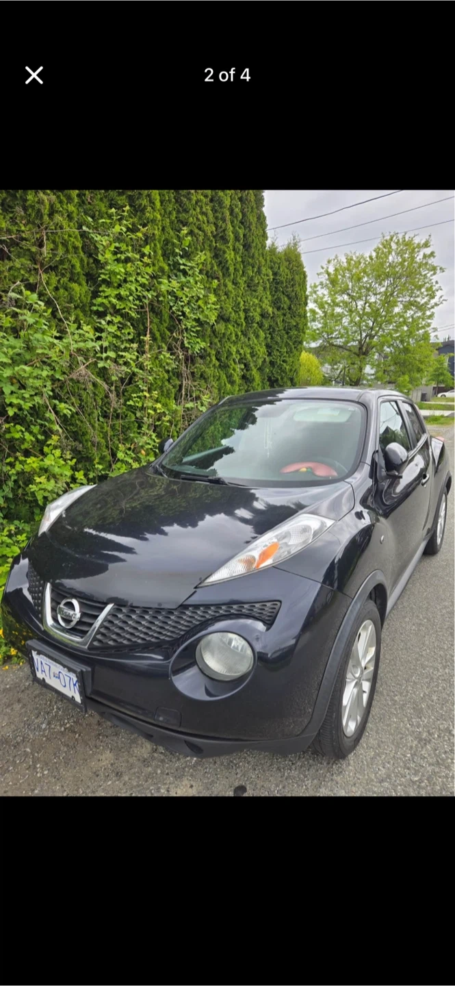 Black Nissan Juke. This compact crossover offers a stylish design and comfortable ride. It's a great option for city driving and everyday errands. Comes with alloy wheels and a black exterior with red accents on the roof spoiler and mirror caps.
