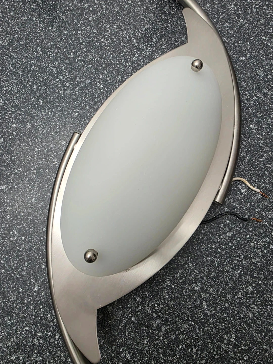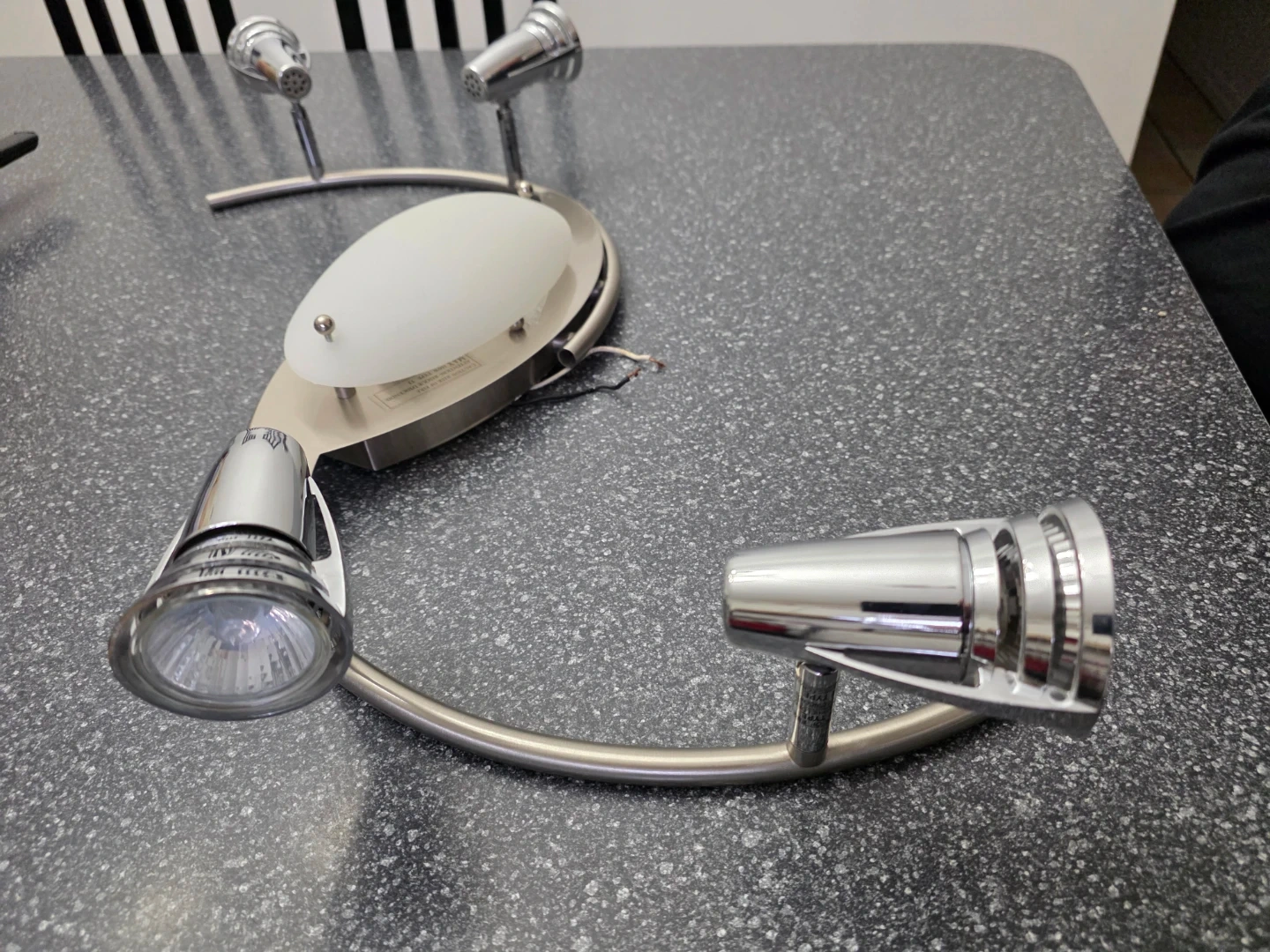 This brushed nickel track lighting fixture features a stylish swirl design with four adjustable spotlight heads. It includes a frosted glass centre light cover and is designed for 120V, Type T3 bulbs. The fixture's metal construction ensures durability. Used but still in great condition.