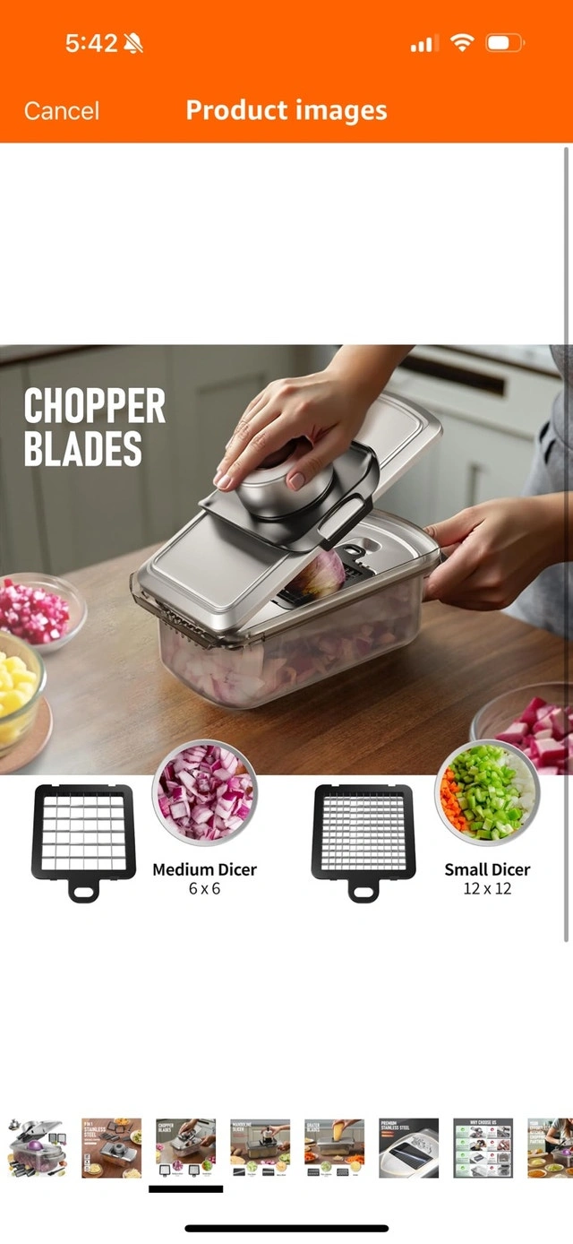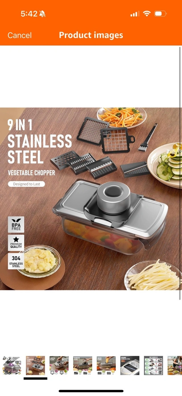 This is a 9-in-1 stainless steel vegetable chopper, designed to last! This item is used but in good condition. Includes multiple blades for dicing, slicing, grating, and more. It's BPA-free and made with premium quality 304 stainless steel. * 9-in-1 functionality * Stainless steel blades * BPA-free material * Includes multiple attachments