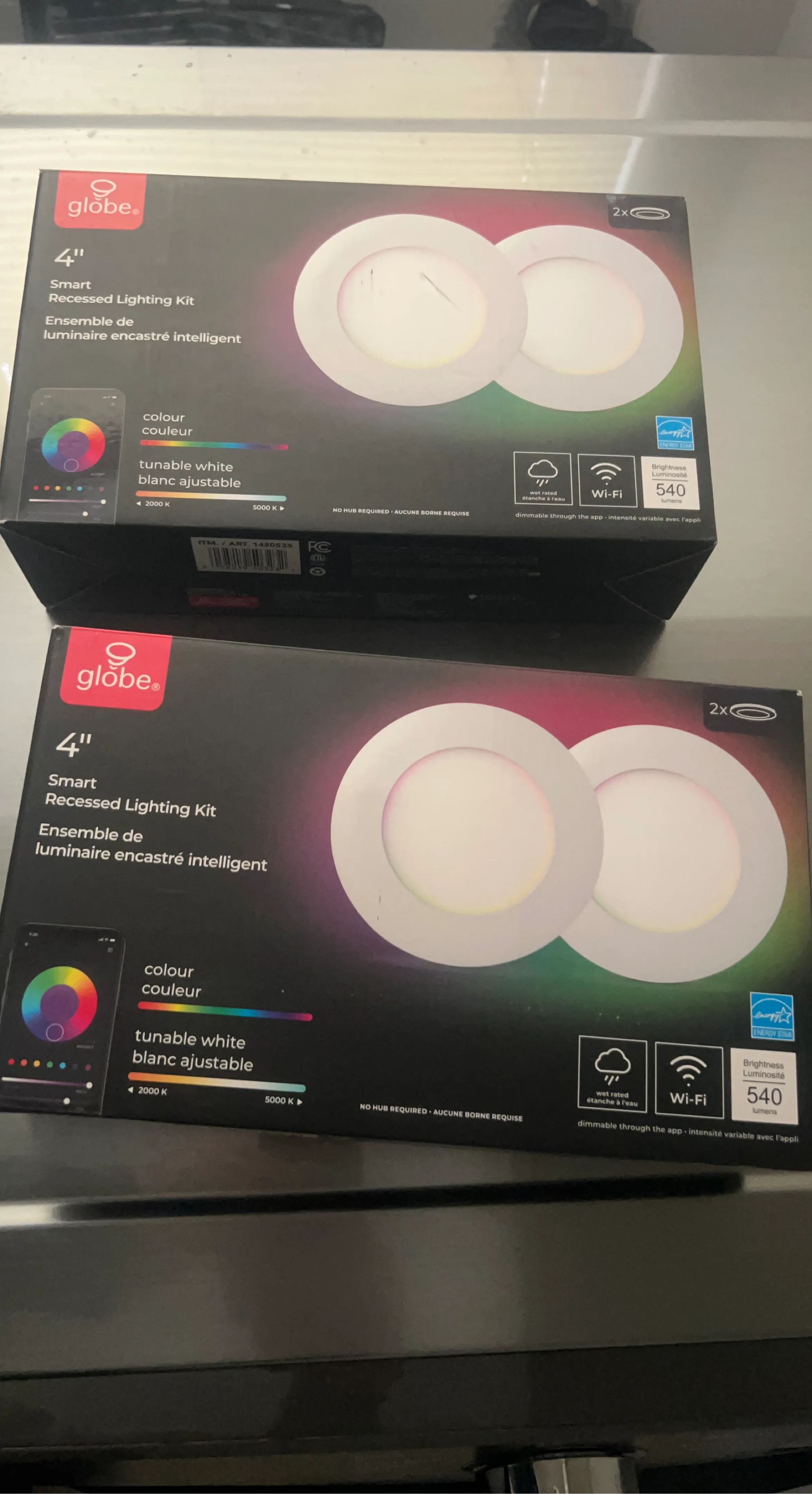 This is a 2-pack of Globe 4" Smart Recessed Lighting Kits. They feature tunable white light from 2000K to 5000K and are wet-rated. These lights are Wi-Fi enabled and dimmable through an app, offering 540 lumens each. No hub is required for operation. I have set of 2. One for $30 or 2 for $50