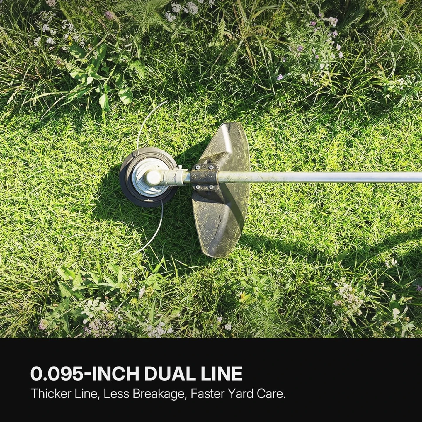 0.095INC DUAL LINE-Two lines working simultaneously delivers 233% higher cutting efficiency than 12" single-line trimmers. Complete trimming along fence lines and ditch edges faster with fewer passes required.