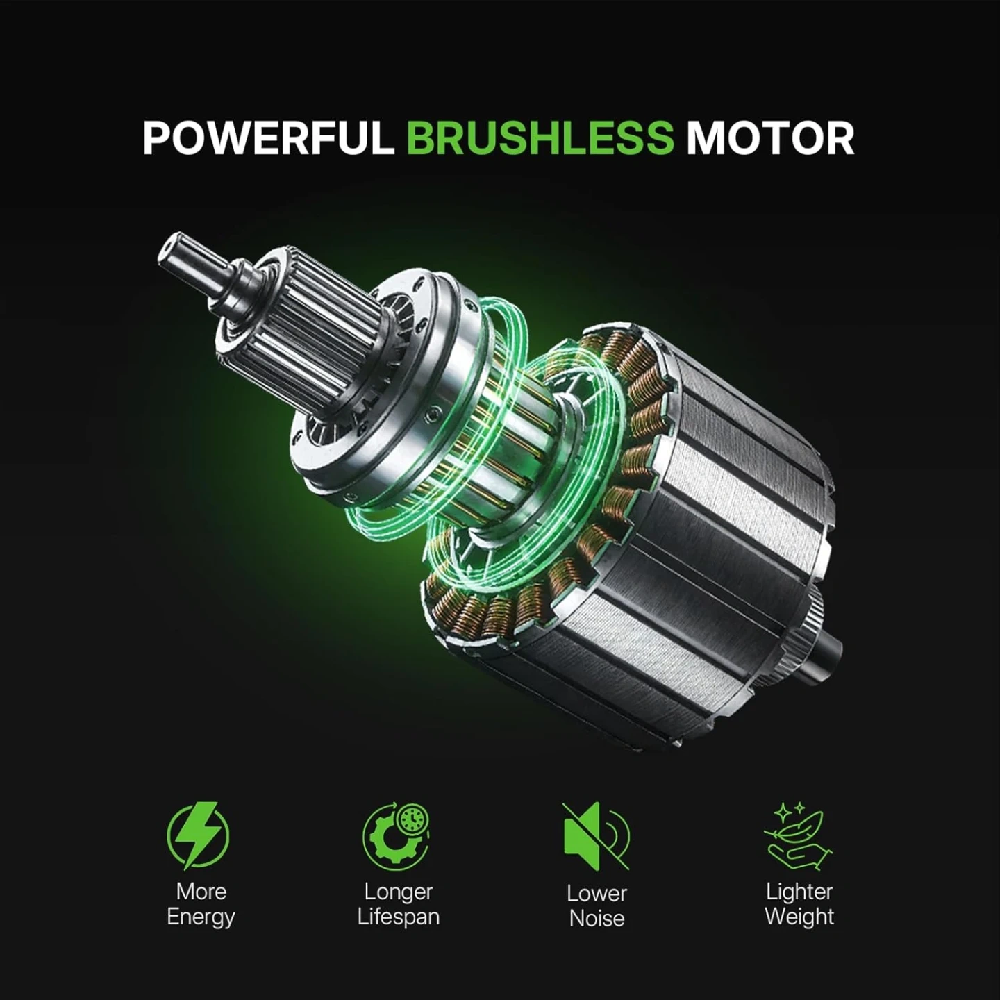 BRUSHLESS MOTOR – Built for performance. Delivers 30% more power than brushed motors, so you can cut through thick weeds without bogging down. Runs cooler and more efficiently for longer battery life. No brushes to maintain—just reliable power, ready when you are.