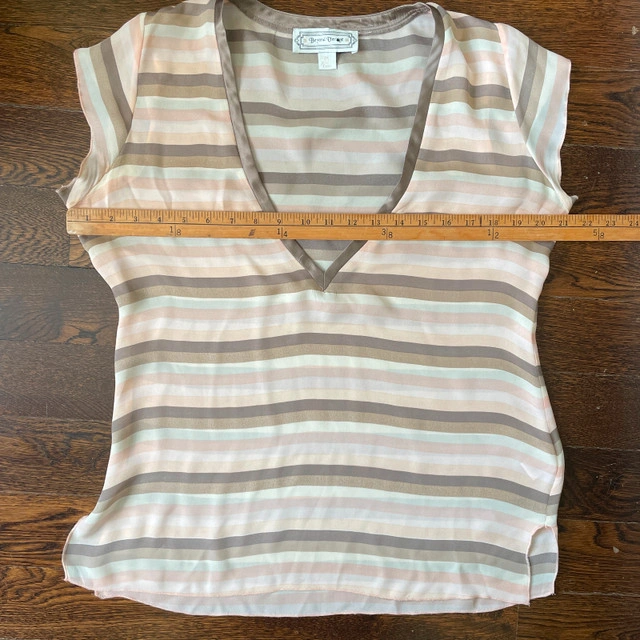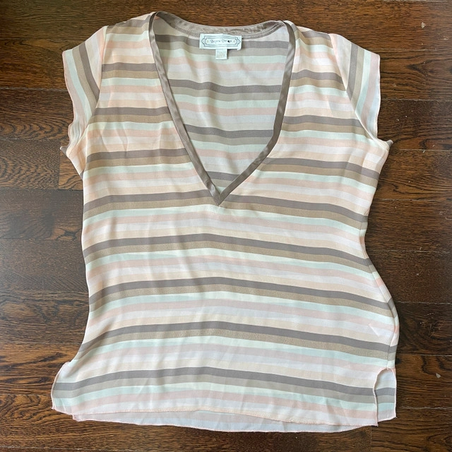 Selling a Beyond Vintage Sleeveless V-neck Blouse top 100% Silk-Medium. Gorgeous pastel neutral mocha and light salmon pink and cream horizontal stripes. Beyond Vintage is known for its vintage-inspired designs and use of delicate fabrics. Pre-loved Measurements lying flat: Pit to pit: 21" Length: 26" Asking $30. Available for pick up in the Broadview/Danforth area. Contact-free porch pick up. Check out my other great stuff!