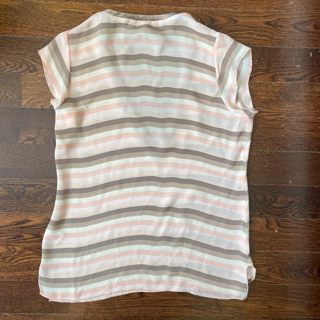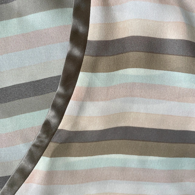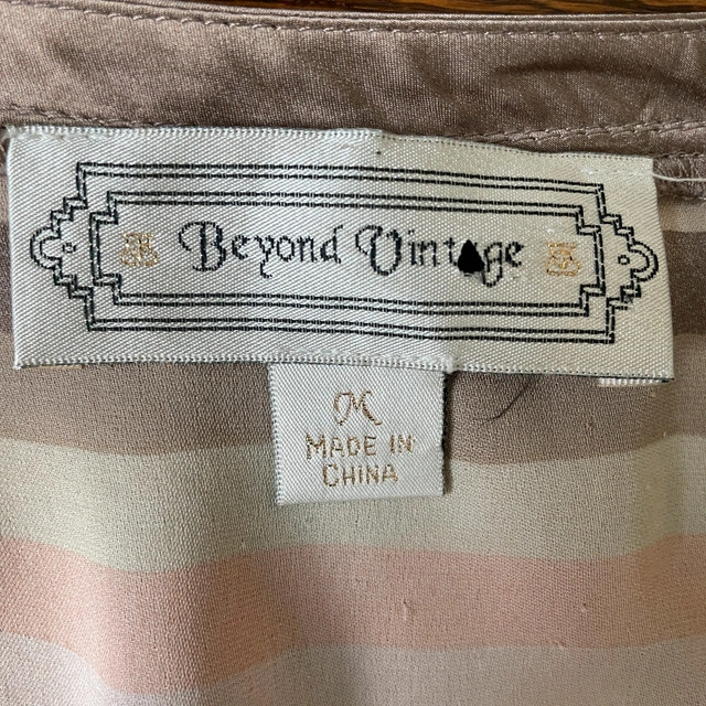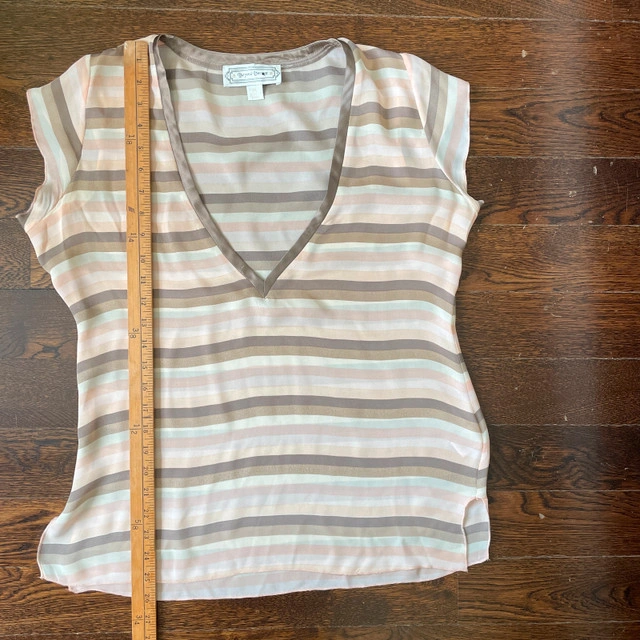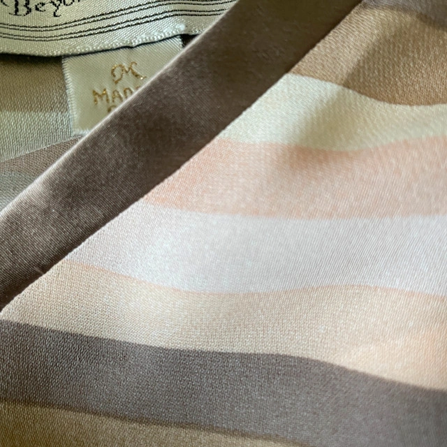 Selling a Beyond Vintage Sleeveless V-neck Blouse top 100% Silk-Medium. Gorgeous pastel neutral mocha and light salmon pink and cream horizontal stripes. Beyond Vintage is known for its vintage-inspired designs and use of delicate fabrics. Pre-loved Measurements lying flat: Pit to pit: 21" Length: 26" Asking $30. Available for pick up in the Broadview/Danforth area. Contact-free porch pick up. Check out my other great stuff!