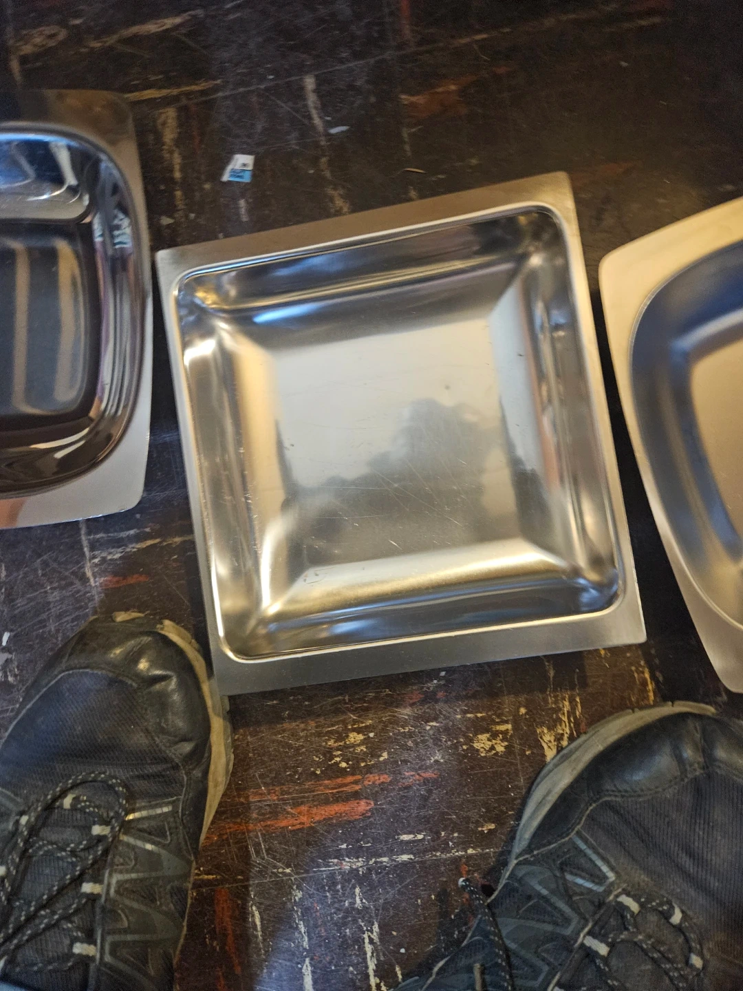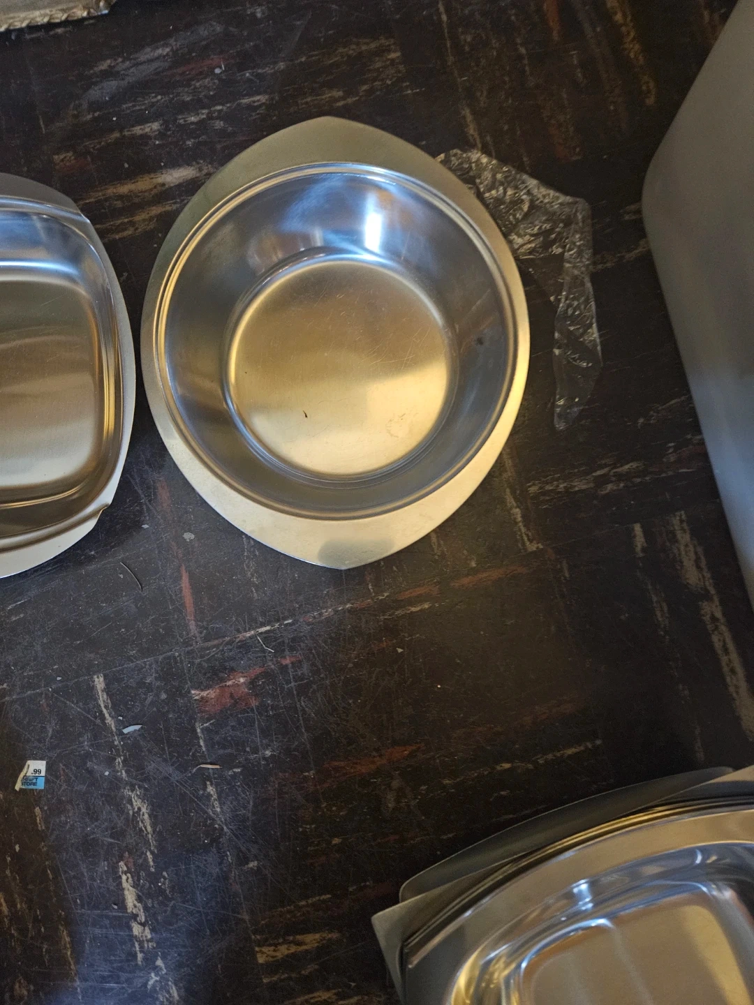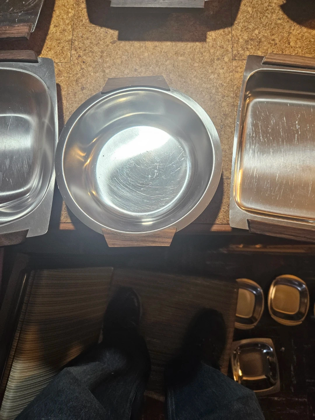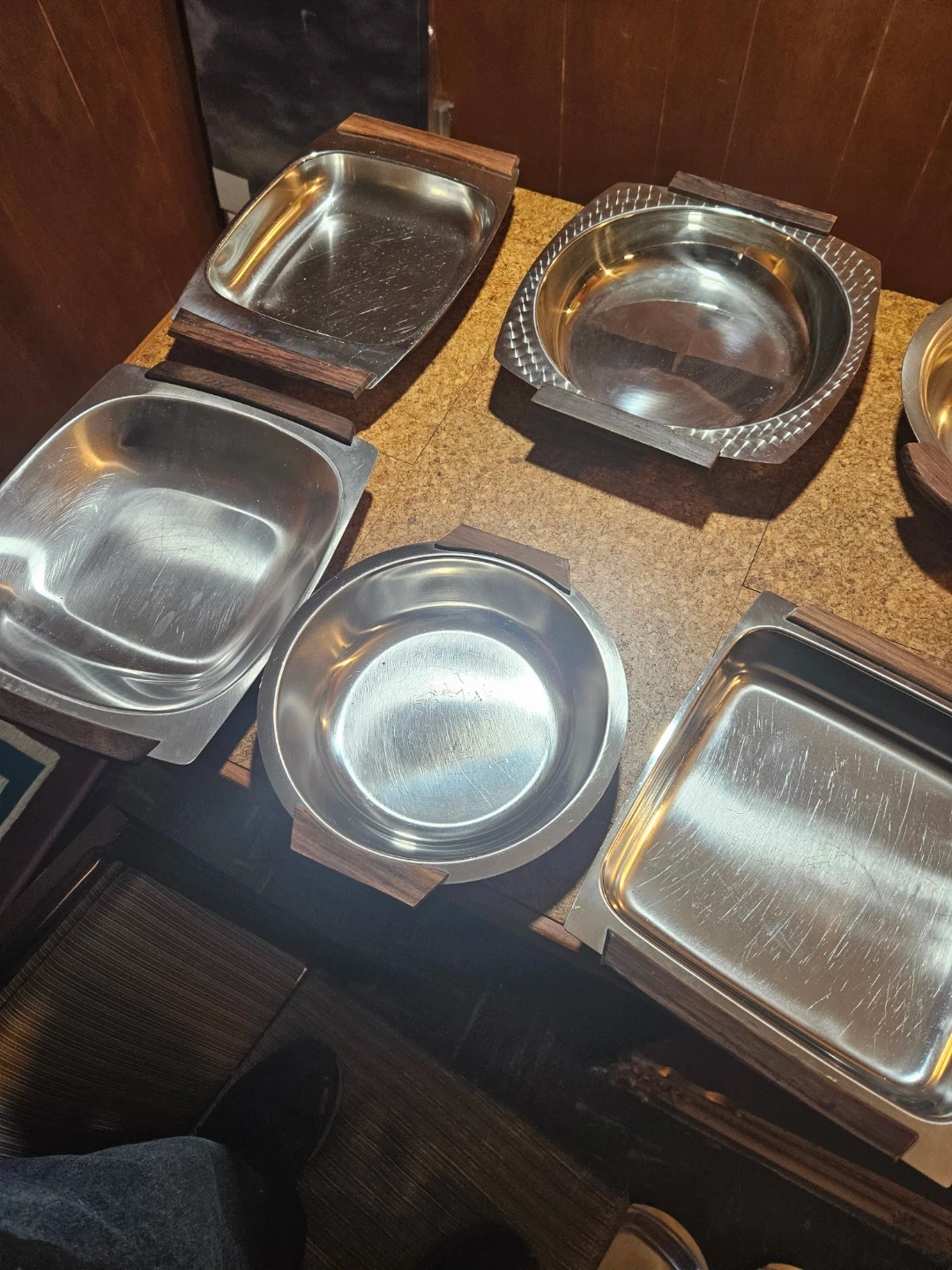 A collection of eight stainless steel serving dishes, some with decorative wood accents. They're great for buffet-style serving or potlucks. Ideal for keeping dishes warm or cold for gatherings!