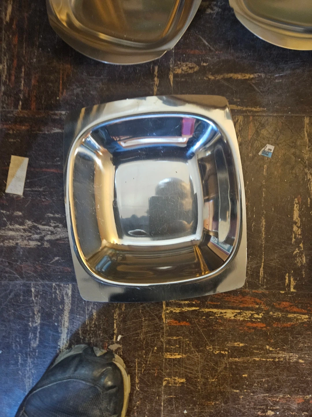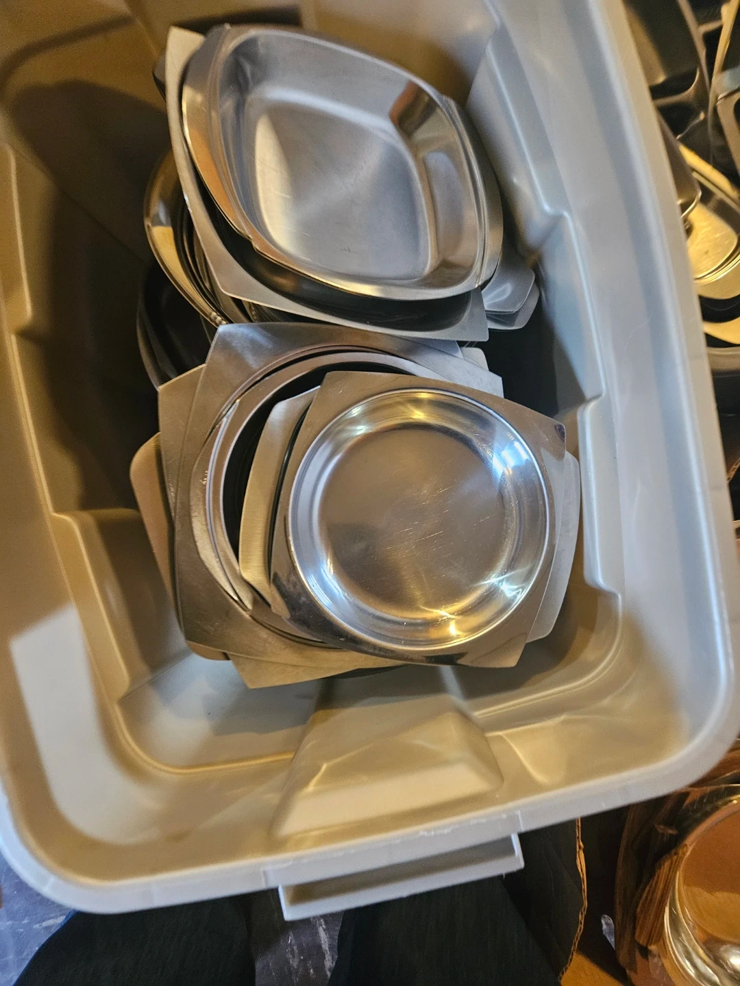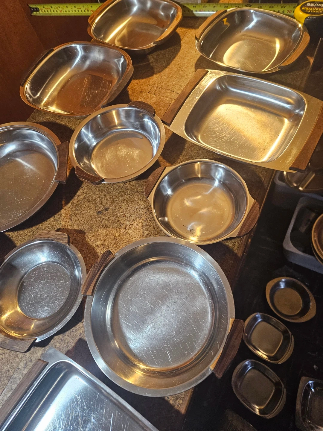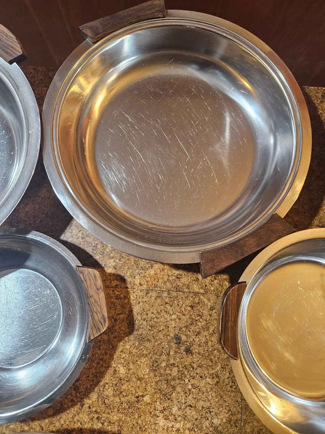 A collection of eight stainless steel serving dishes, some with decorative wood accents. They're great for buffet-style serving or potlucks. Ideal for keeping dishes warm or cold for gatherings!