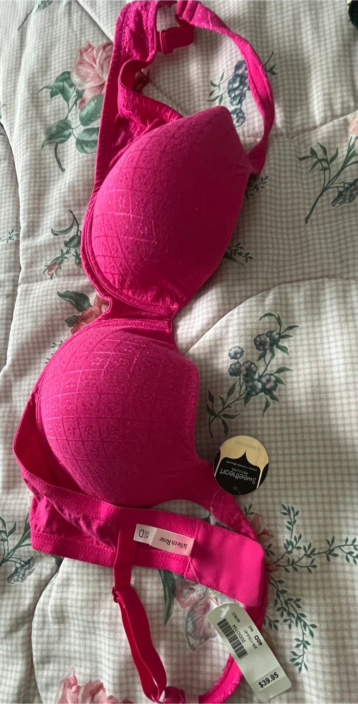 This is a pink Sweetheart bra by La Vie en Rose. It's a size 40D with a textured pattern. The bra has adjustable straps.