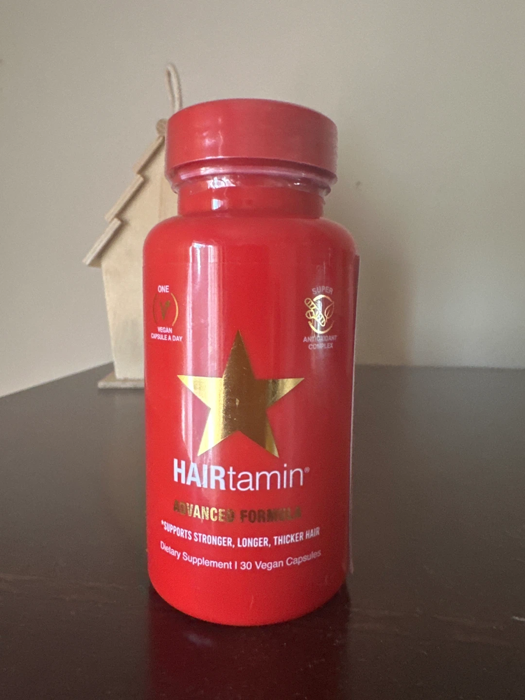 Selling a bottle of Hairtamin Advanced Formula hair supplement. It supports stronger, longer, and thicker hair. Dietary Supplement, 30 Vegan Capsules. Expiry Date is 11/2025