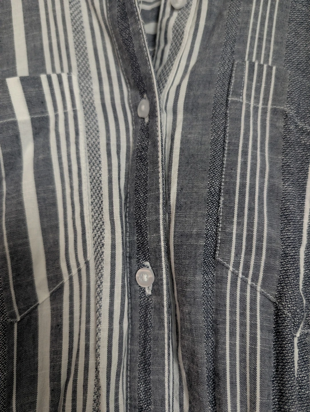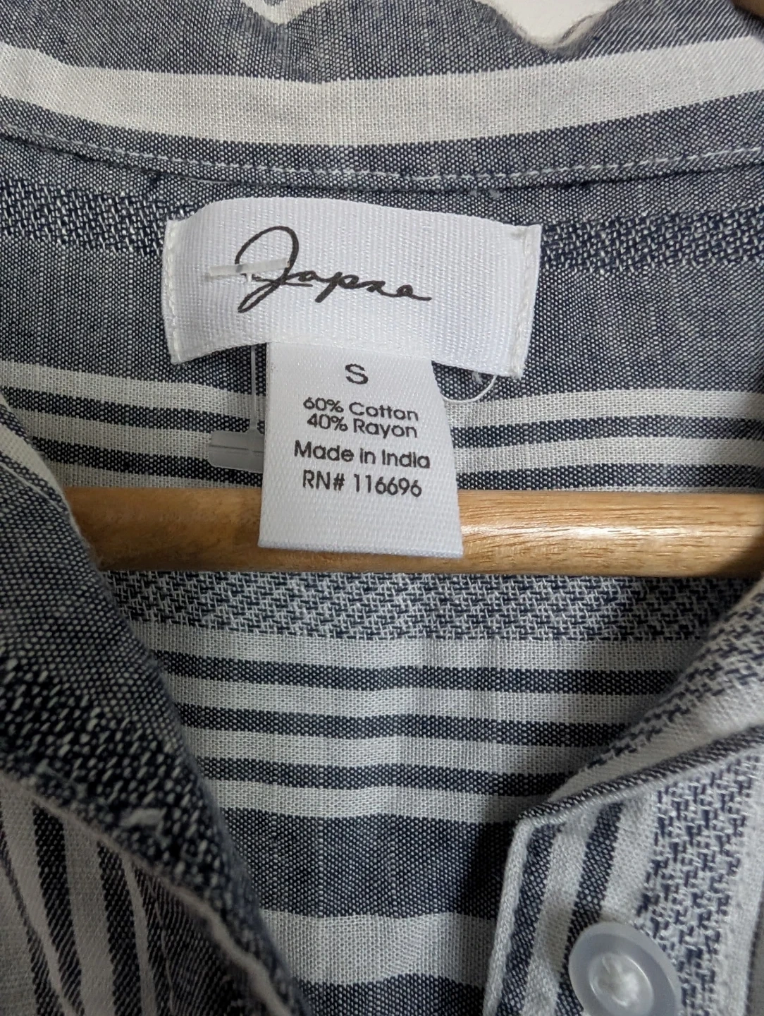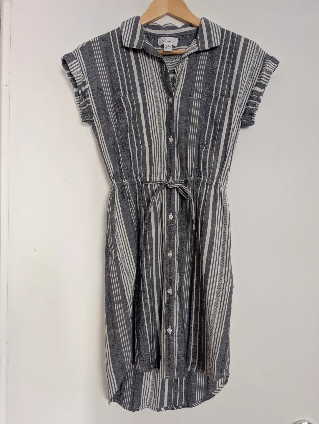 This Japna dress features a stylish grey and white stripe pattern. It's made from a 60% cotton and 40% rayon blend. The dress is a size small with short sleeves and a tie waist. It comes with two button-flap chest pockets.