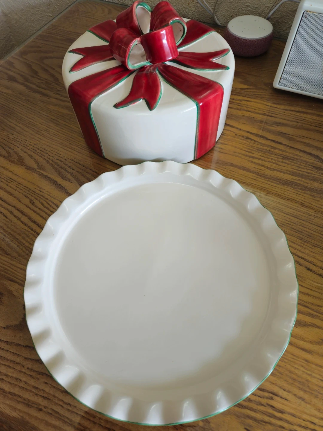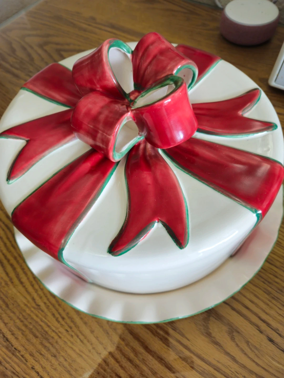 A festive ceramic serving platter designed to look like a wrapped gift. It's made of durable ceramic and is crafted in Portugal. This piece is perfect for holiday gatherings or special occasions!