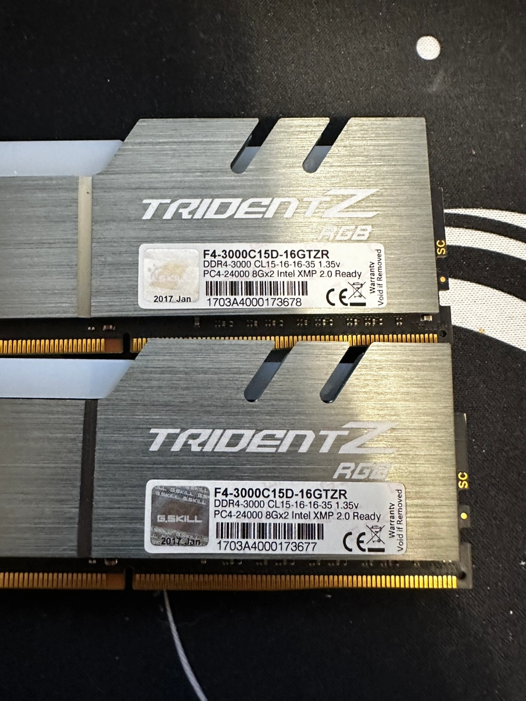 Pair of G.Skill Trident Z RGB RAM modules. DDR4-3000, CL15-16-16-39, 1.35V. Intel XMP 2.0 Ready. 16GB total from the same kit.