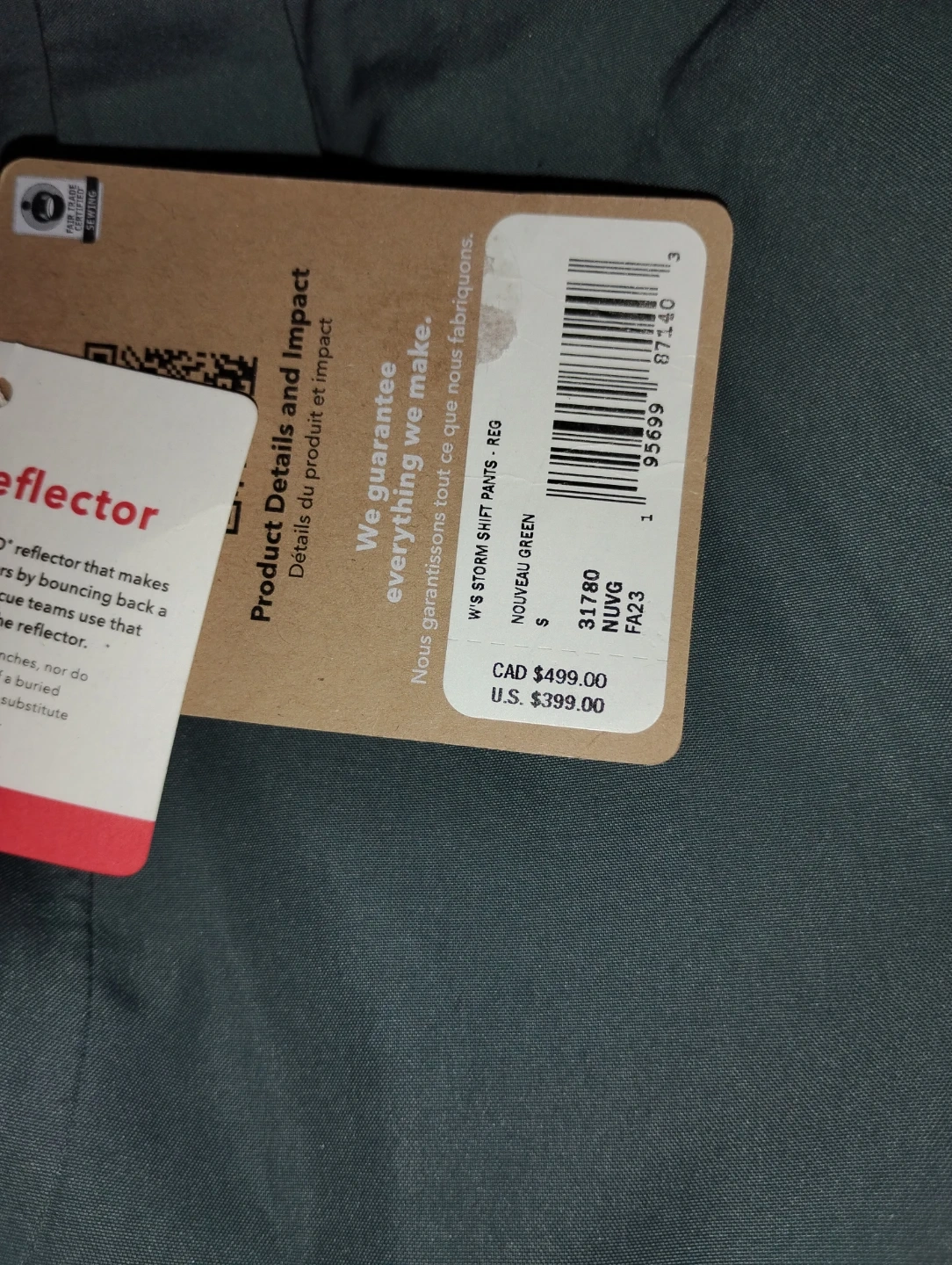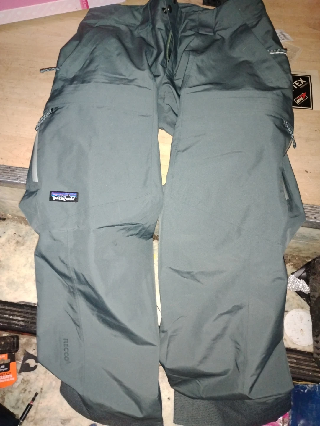 These Patagonia Storm Shift pants are made with GORE-TEX fabric in Nouveau Green. They're a size small. The pants include RECCO reflectors for avalanche safety.