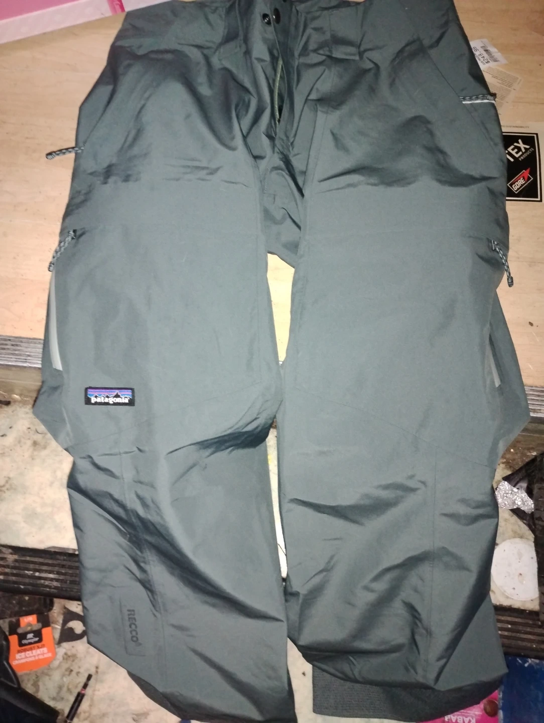 These Patagonia Storm Shift pants are made with GORE-TEX fabric in Nouveau Green. They're a size small. The pants include RECCO reflectors for avalanche safety.