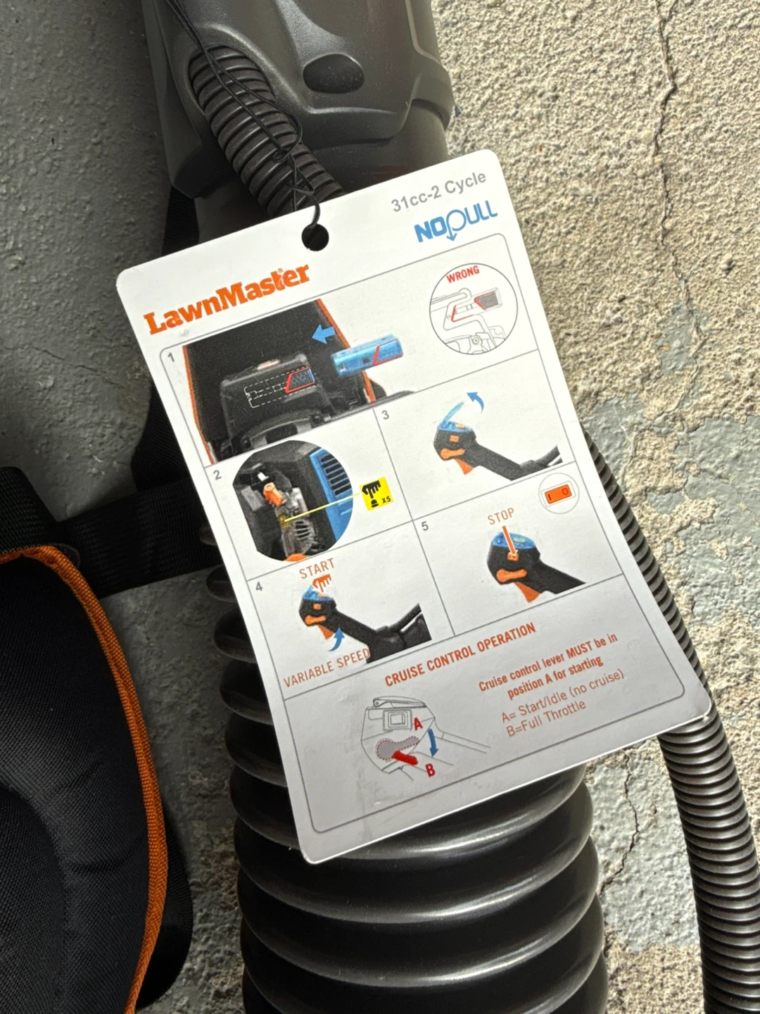 Looking to clear some leaves? This LawnMaster NoPull 31cc 2-Cycle blower is ready to go! It comes with a handy backpack for easy carrying. Check out the photos for details on operation and starting instructions