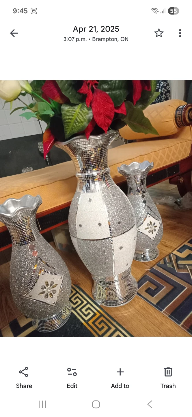 Add a touch of sparkle to your space with this set of three silver mosaic vases! They're in great condition and ready to brighten up any room. Perfect for displaying your favourite flowers or as standalone decorative pieces