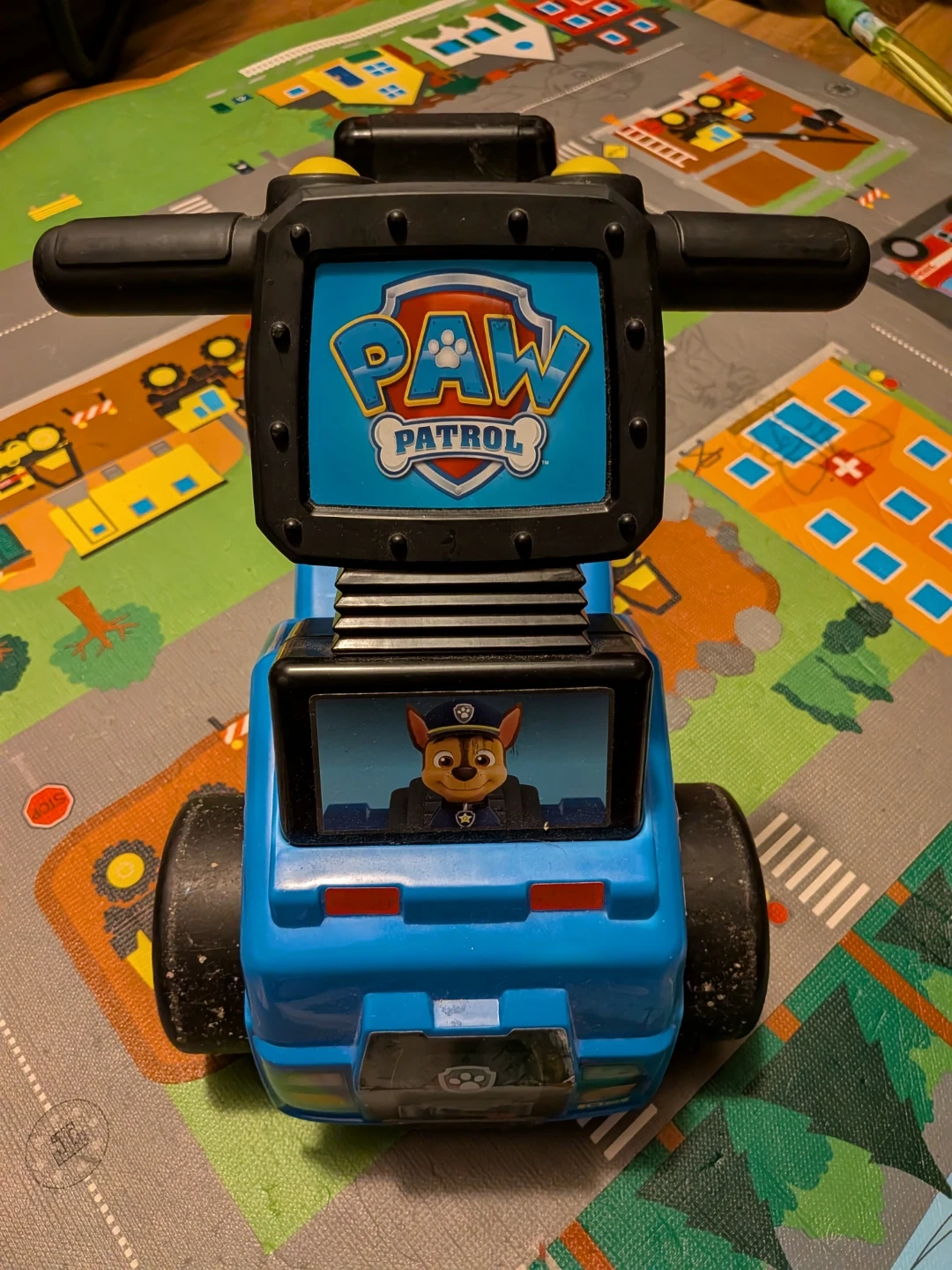 A blue Paw Patrol ride-on car featuring Chase. It's a fun toy for kids who love Paw Patrol adventures. Perfect for imaginative play and developing motor skills! Plays a song and starting sound.
