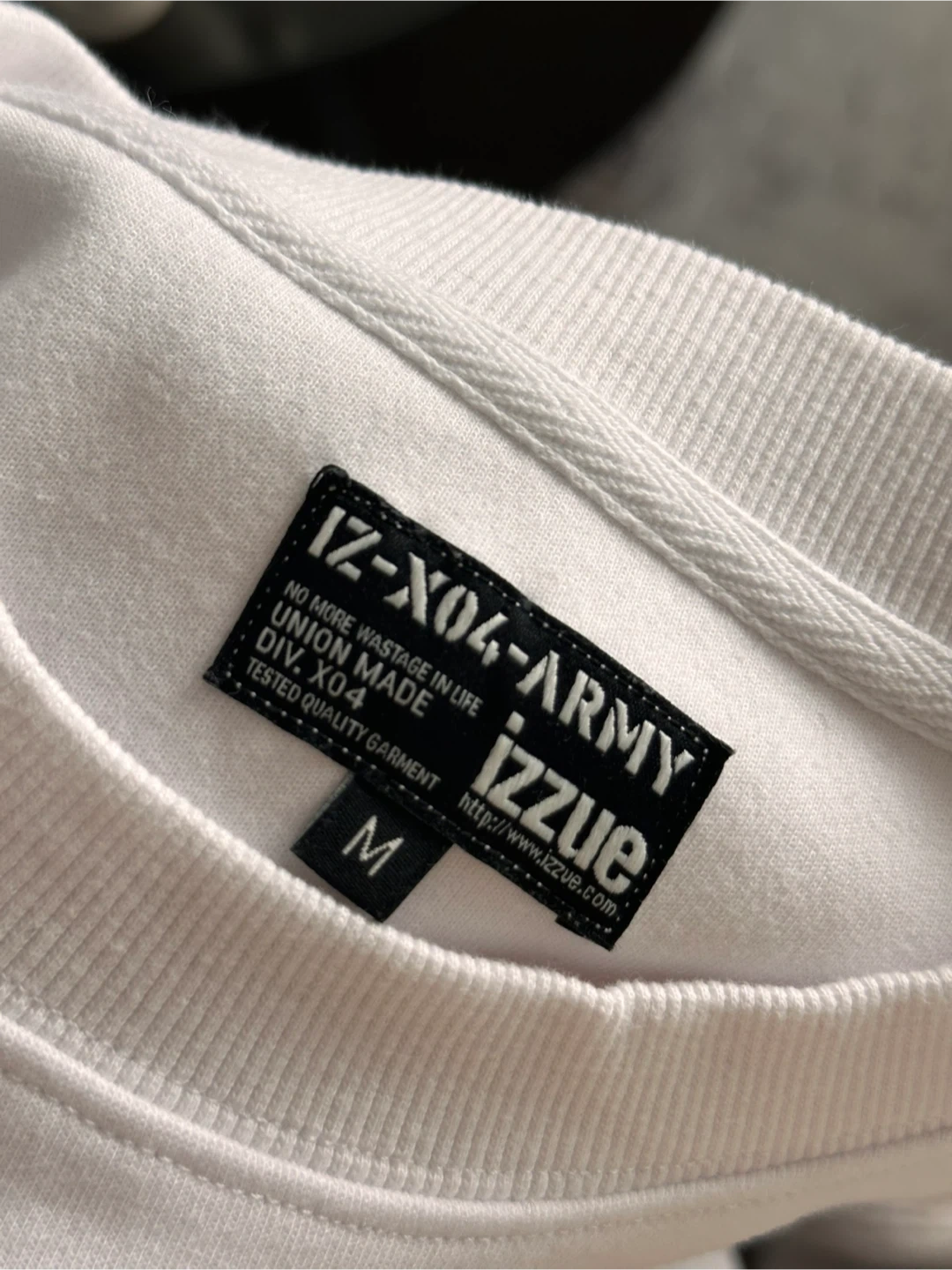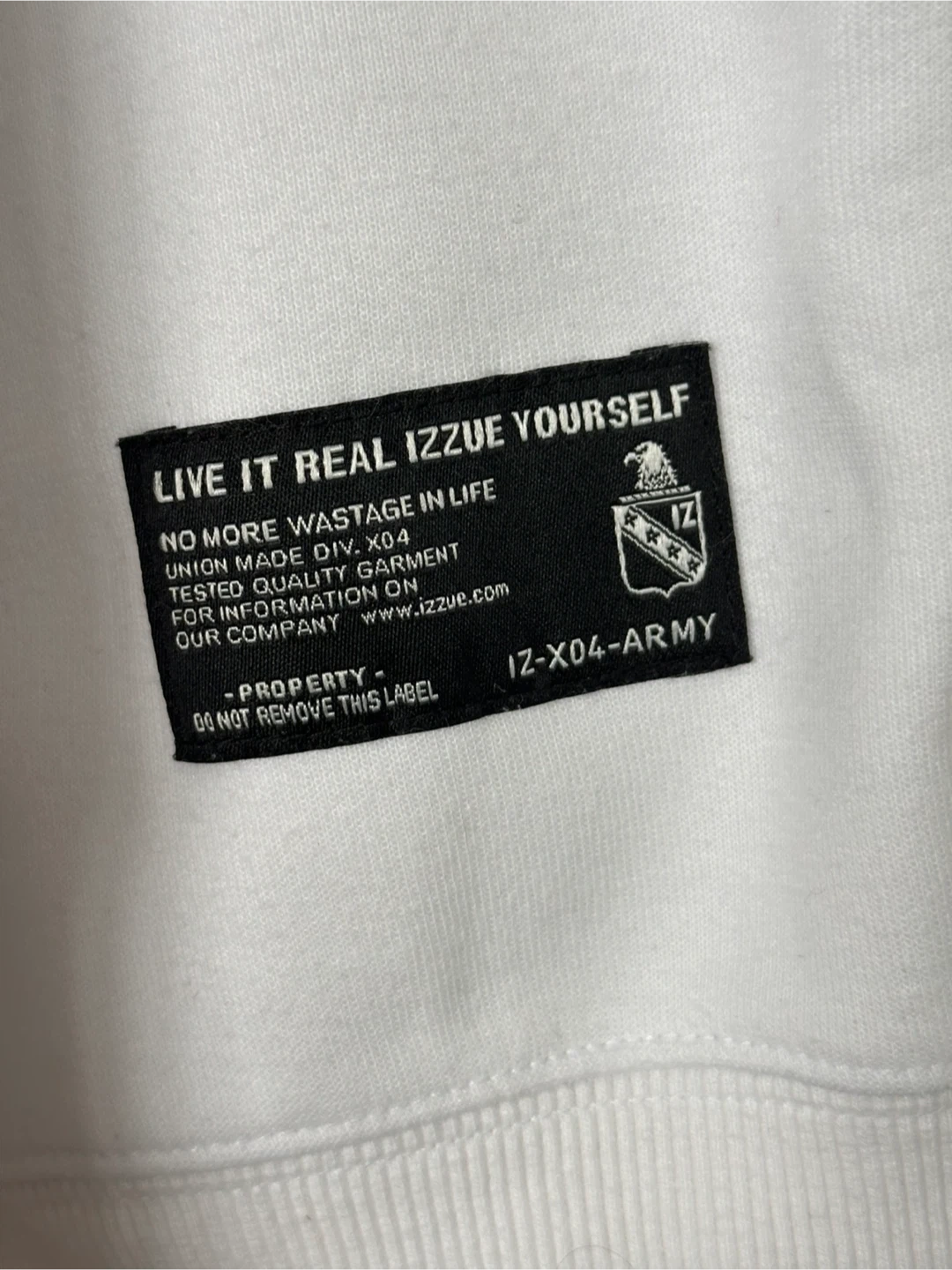White IZZUE-ARMY sweatshirt with "Academy" graphic. "Union Made" and "Military Specification" details. Size medium. Tested quality garment.