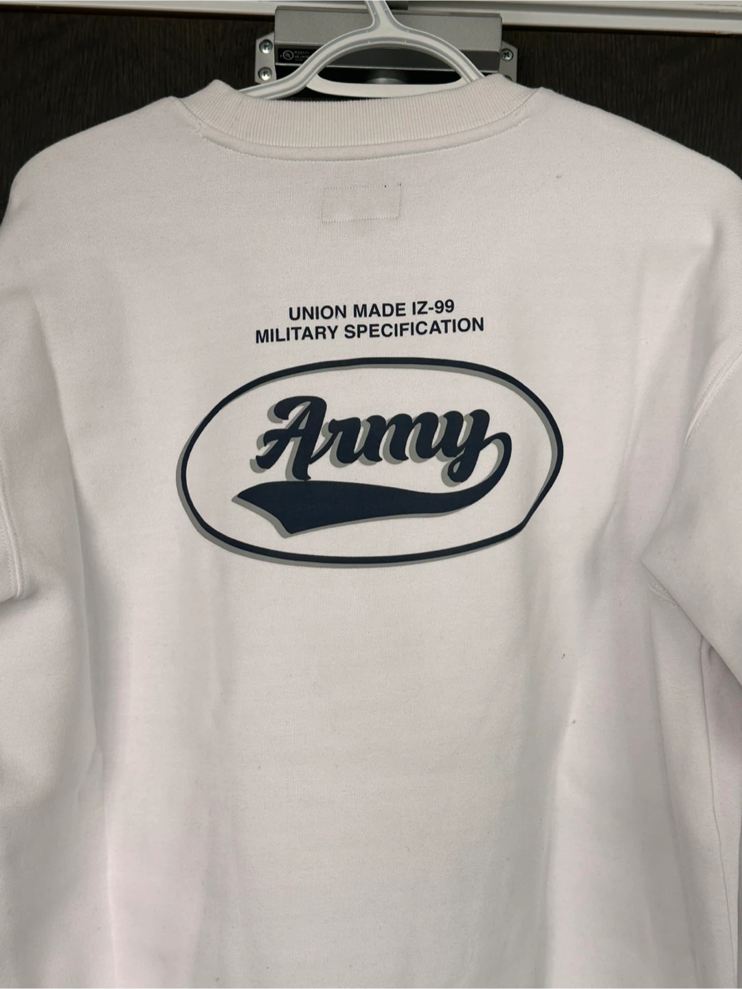 White IZZUE-ARMY sweatshirt with "Academy" graphic. "Union Made" and "Military Specification" details. Size medium. Tested quality garment.
