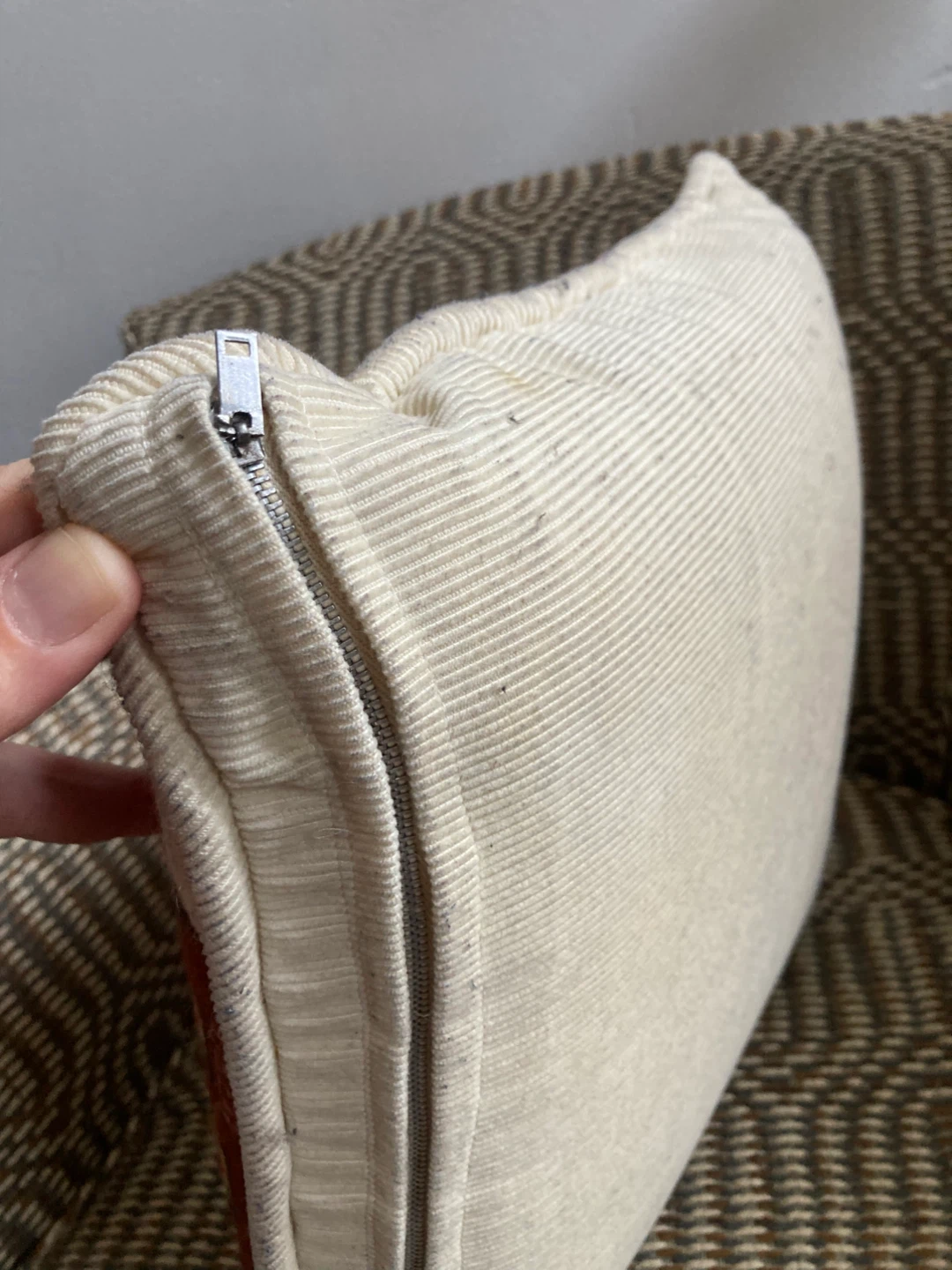 This is a throw pillow with a horse needlepoint design. The pillow has a cream-colored corduroy-like fabric on the back and sides. It has a zipper so you can remove the cover for cleaning