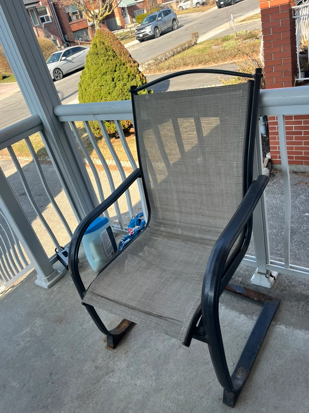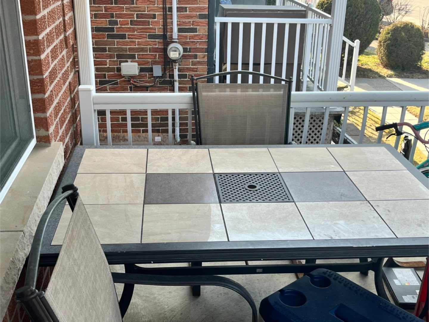 This set includes six chairs and one patio table. The chairs have a metal frame with a woven fabric seat and back. The table features a tile top with a metal frame.