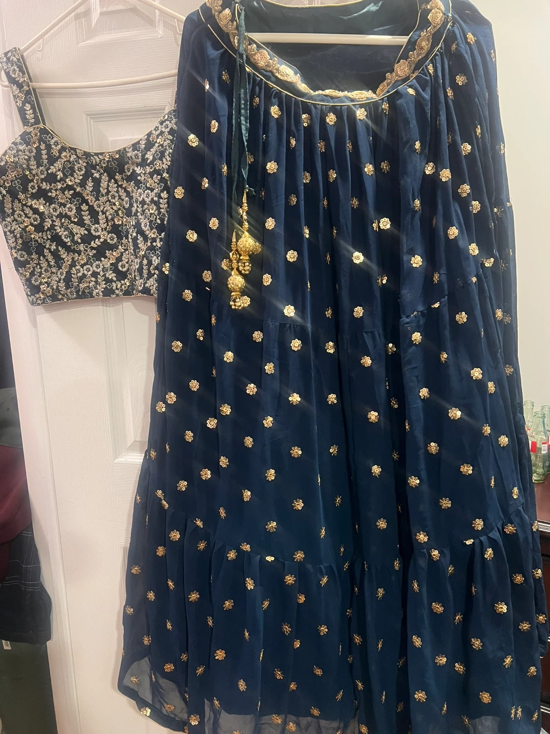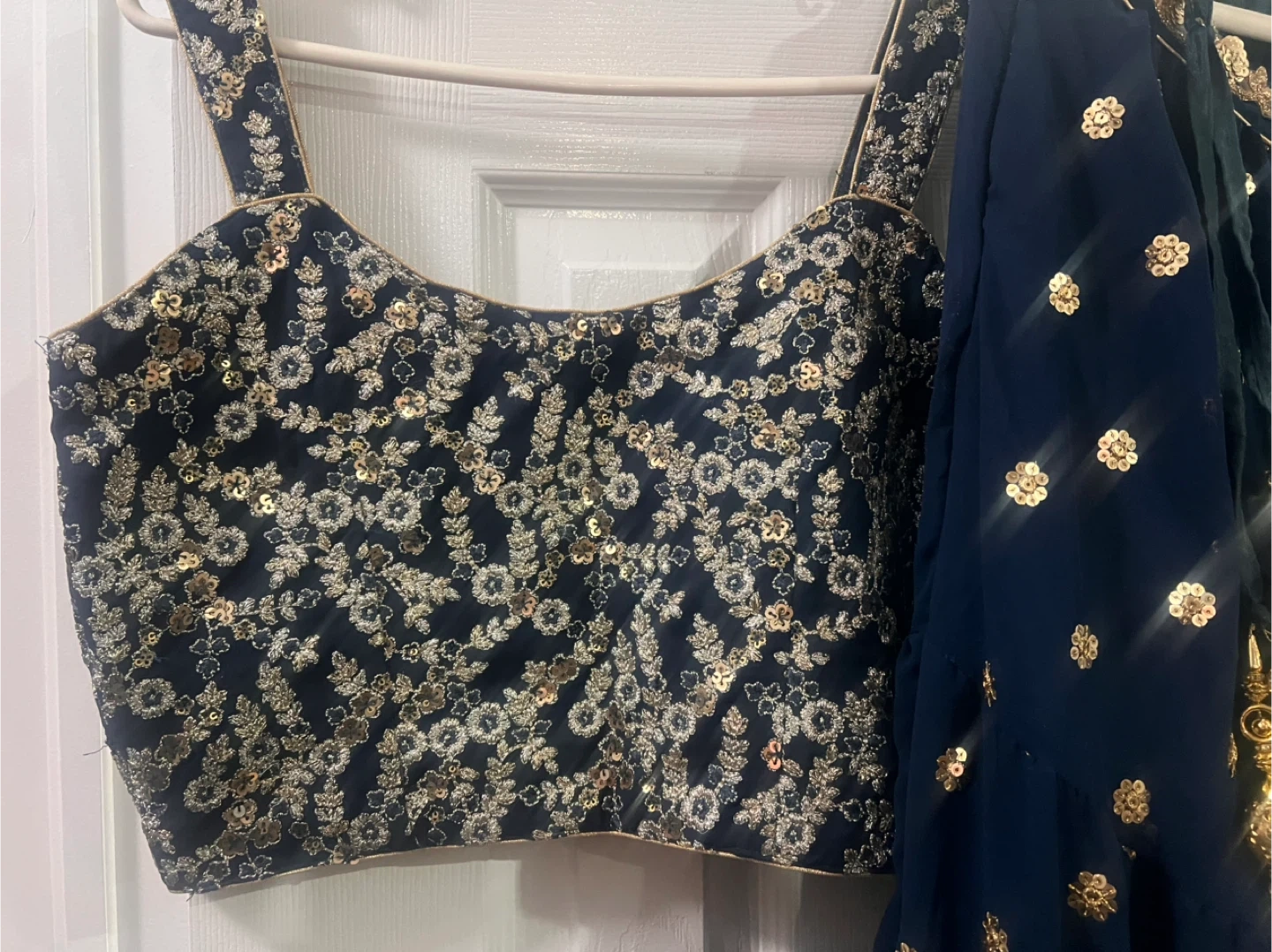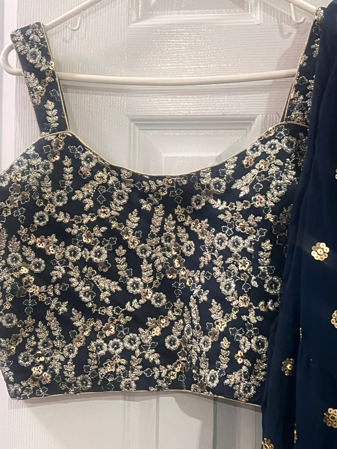 A beautiful navy blue lehenga choli set. It features a richly embroidered choli with intricate floral patterns and sequins. The lehenga is a deep navy with scattered gold floral embellishments and a tiered, ruffled hem. Perfect for festive occasions!