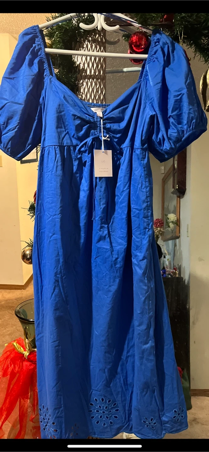 Here's a lovely blue dress from Lauren Conrad! It looks to be in great condition and ready for a new owner. The dress has a tie at the chest and decorative cutouts at the bottom.