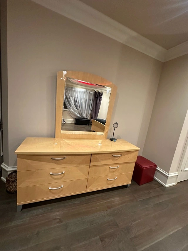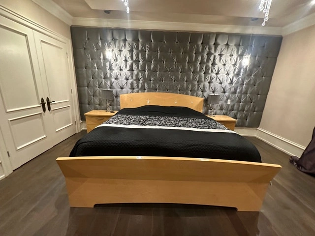 This is a beautiful bedroom set in very good condition! It includes a dresser with a mirror, a bed frame, and an armoire, perfect for furnishing a master suite or guest room. Items can be sold separately. With Mattress no stains at all.