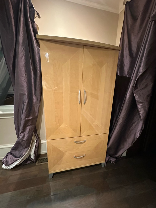 This is a beautiful bedroom set in very good condition! It includes a dresser with a mirror, a bed frame, and an armoire, perfect for furnishing a master suite or guest room. Items can be sold separately. With Mattress no stains at all.