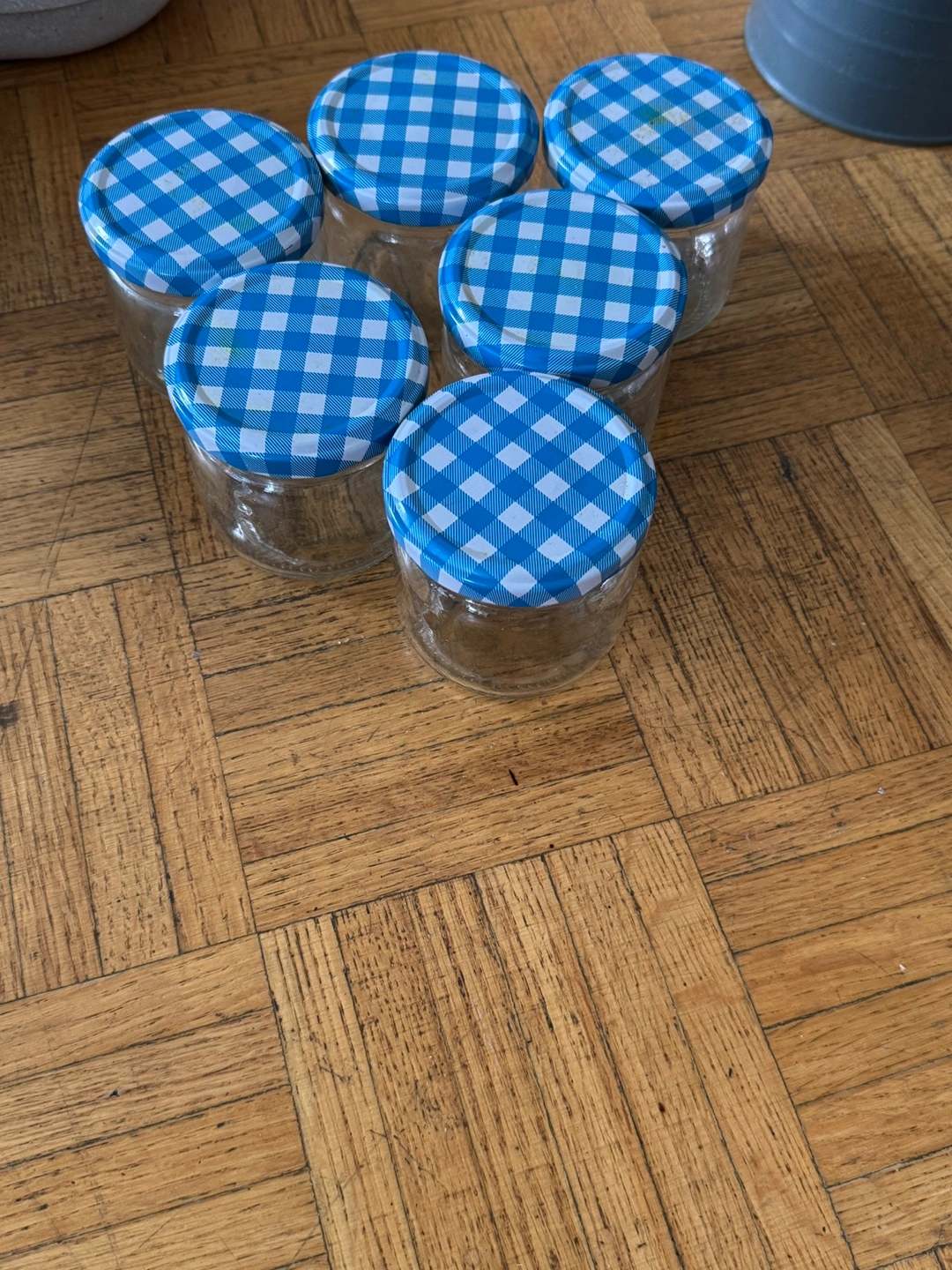 Six small glass jars. Blue and white gingham patterned lids. Perfect for preserves or small storage.