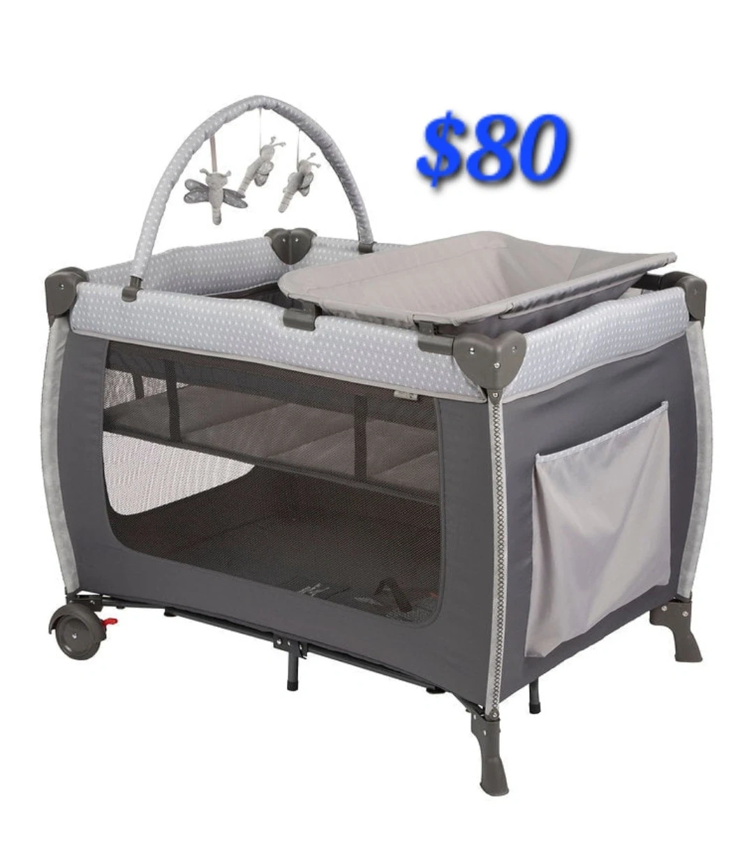 This Graco Pack 'n Play playard is a portable crib and play space. It's grey with a white star pattern. It includes a changing pad and mobile. This playard is useful for nap time or playtime on the go!
