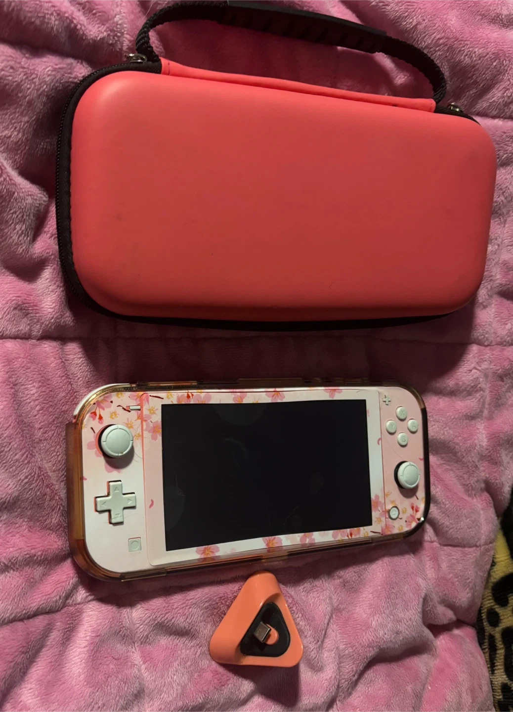 Pink Switch Lite. Currently has a cherry blossom skin that can be removed. Rarely used. Has been kept in a clear case with a screen protector since purchased. Both included plus an extra screen protector, and the hard-shell pink carrying case. Also include included is the standing charger. See photos.