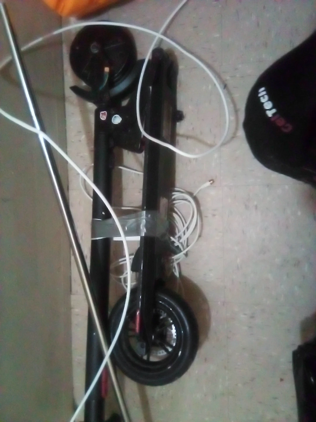 This is a black electric scooter. It's foldable for easy transport. Comes with charging cables. This scooter is suitable for rides around town!