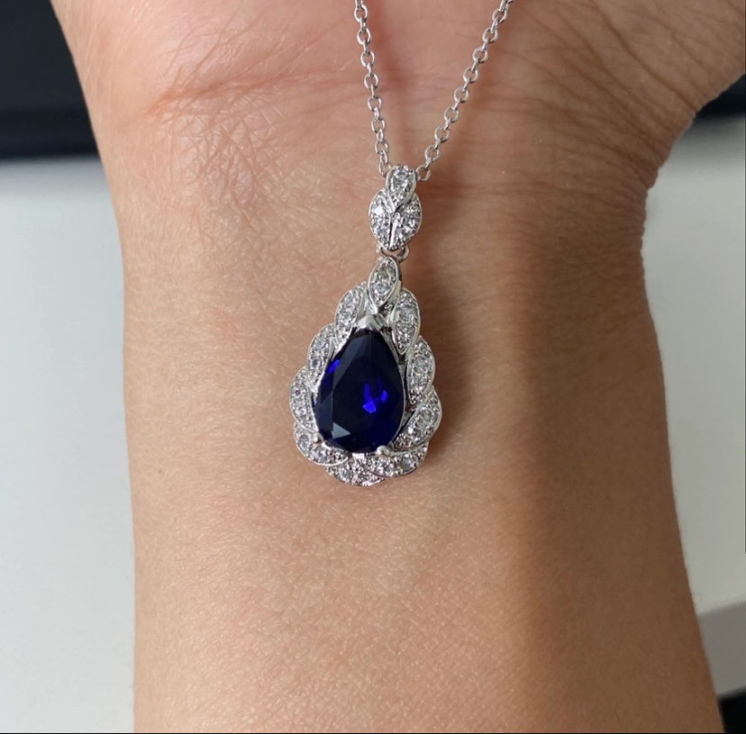 Beautiful silver pendant necklace featuring a pear-cut blue sapphire Color rhinestone surrounded by smaller clear stones. Makes a lovely accessory for any occasion!
