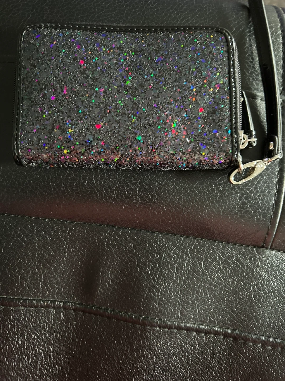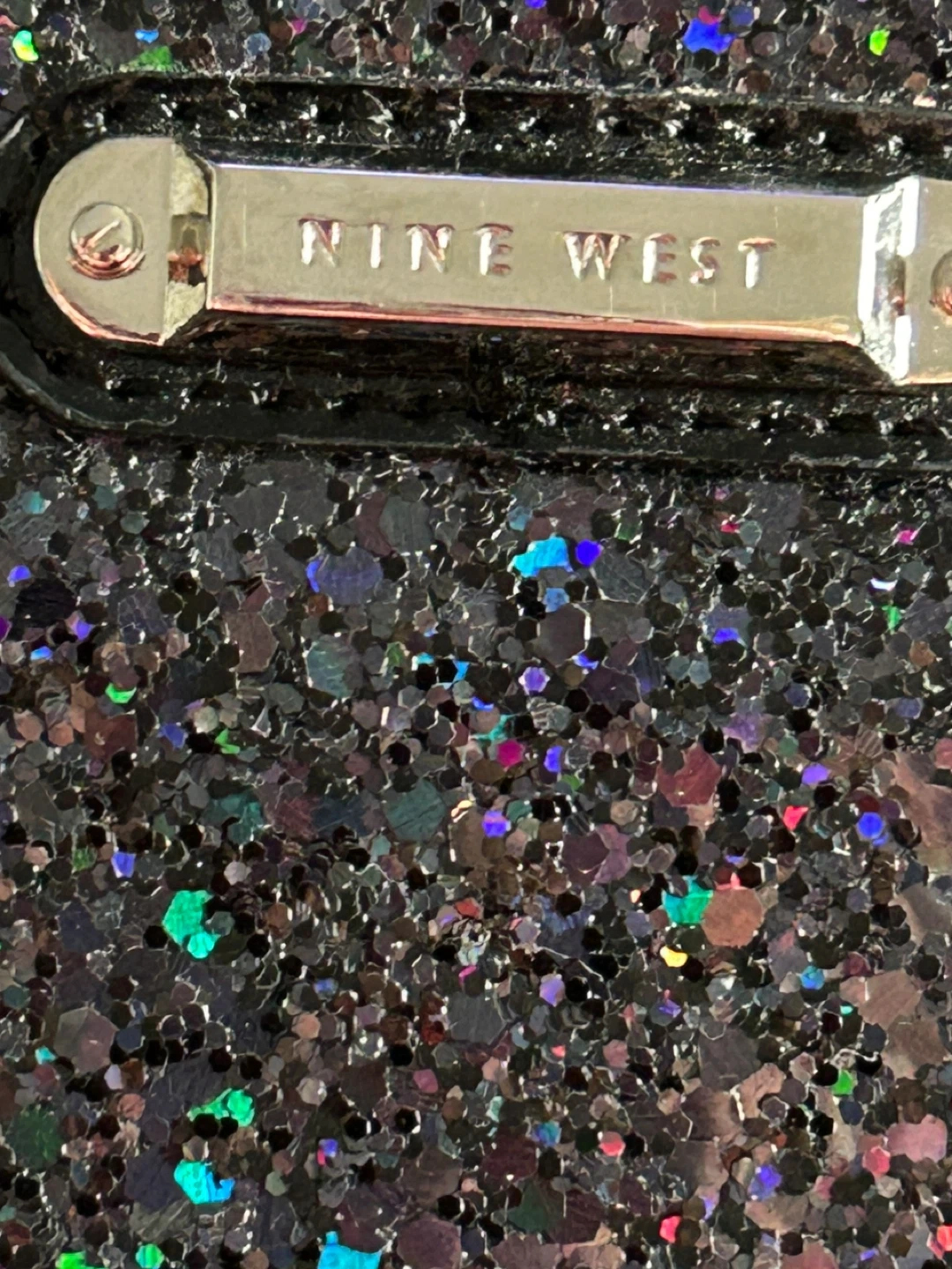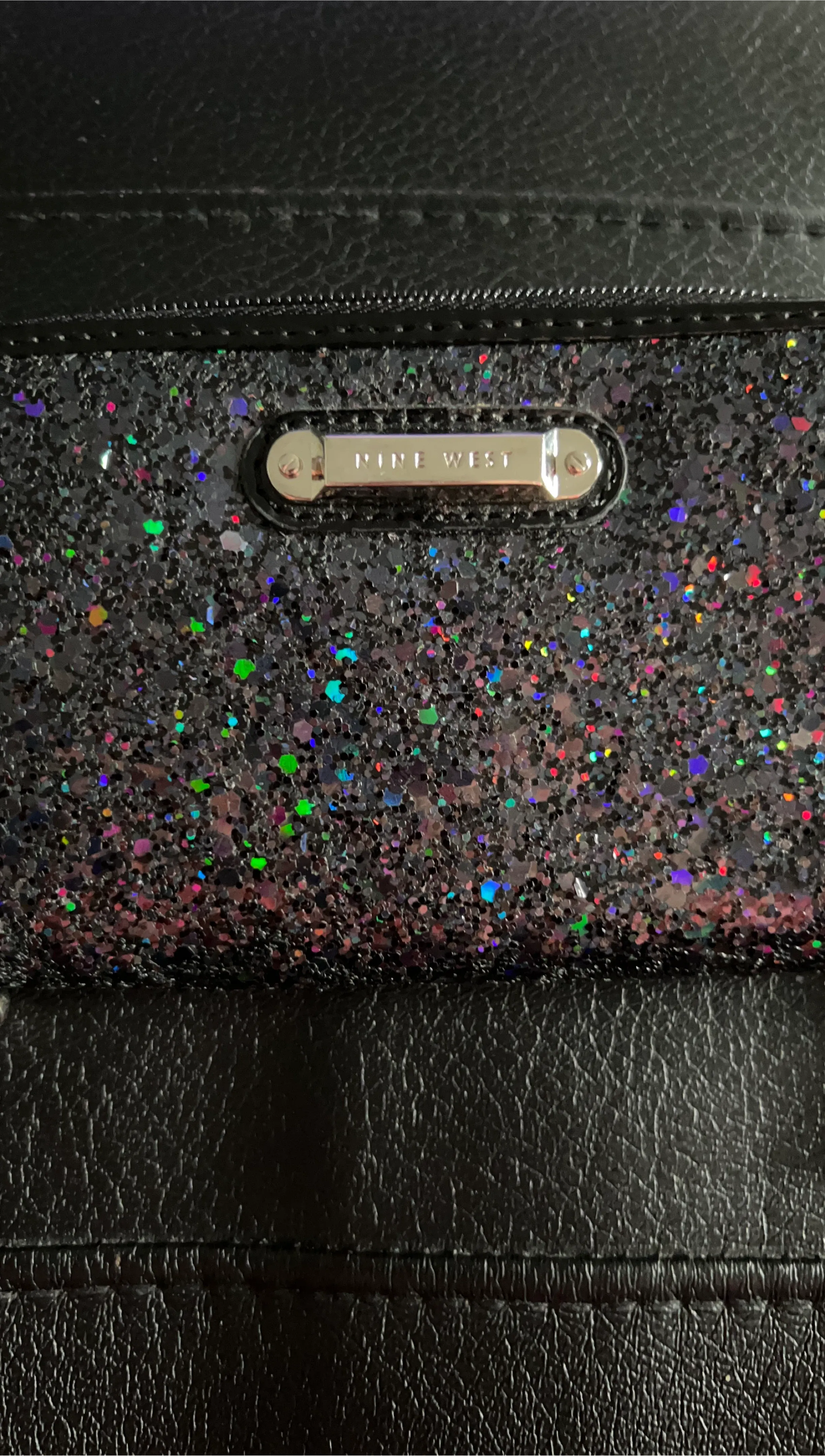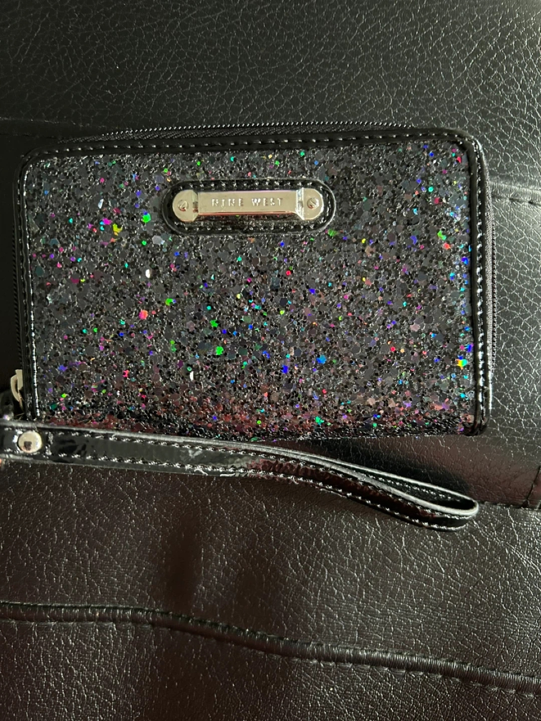 This Nine West wristlet wallet features a sparkly black glitter design. It includes a convenient wrist strap for easy carrying. The compact size makes it great for essentials! I invite you to view my other items; if you are interested in any of them, I will give you a better price.