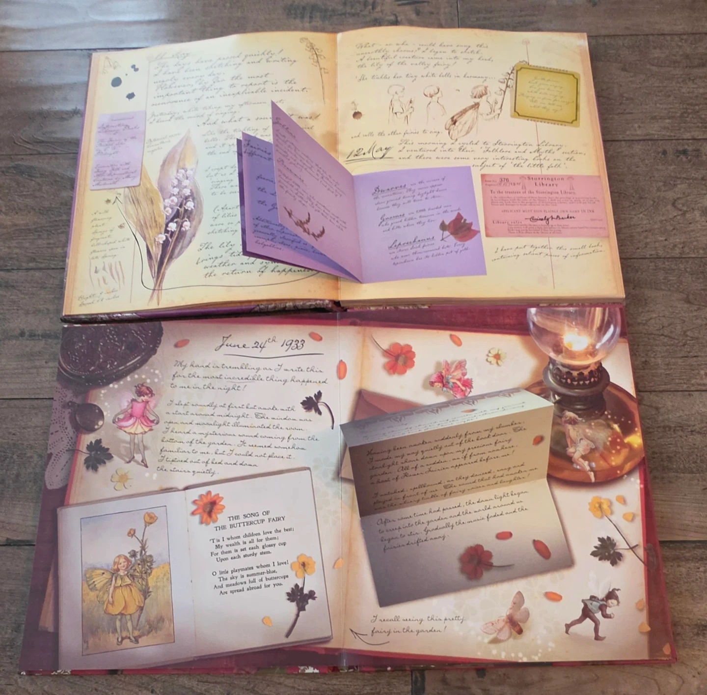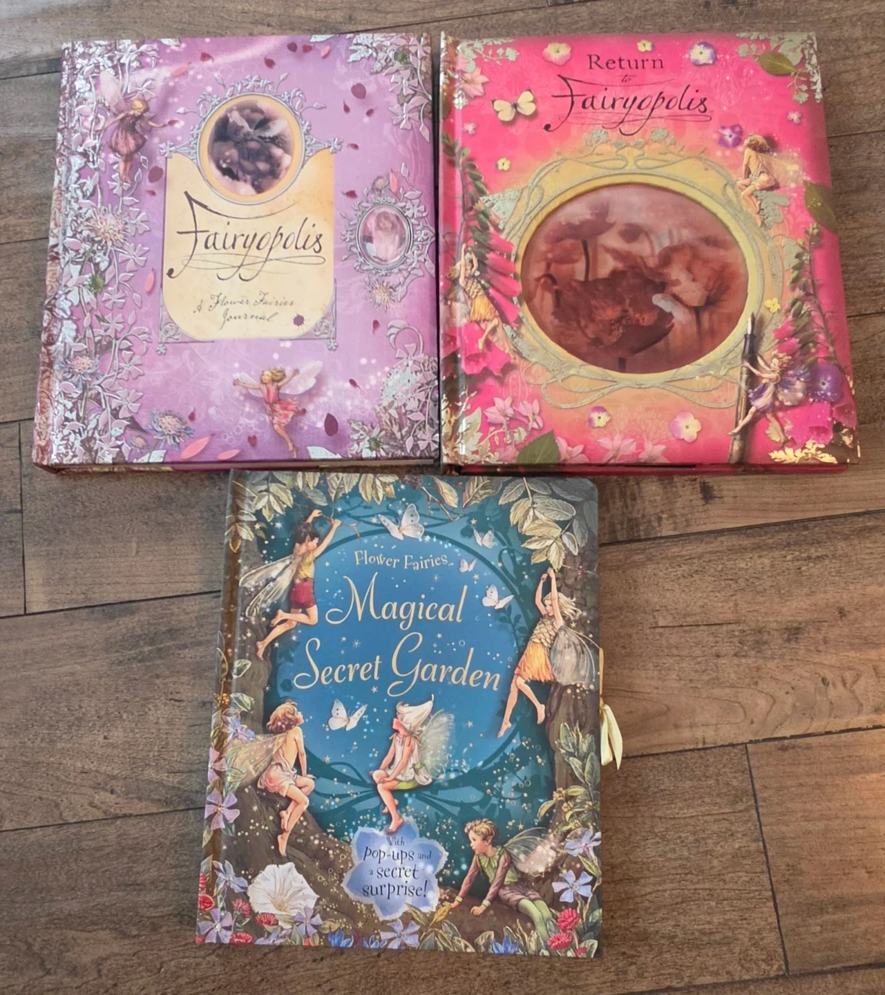 Collection of three pop-up books featuring fairy themes. Titles include 'Fairytopia & Flower Fairies Journal' and 'Flower Fairies Magical Secret Garden'. These interactive books offer intricate pop-up scenes and detailed illustrations.