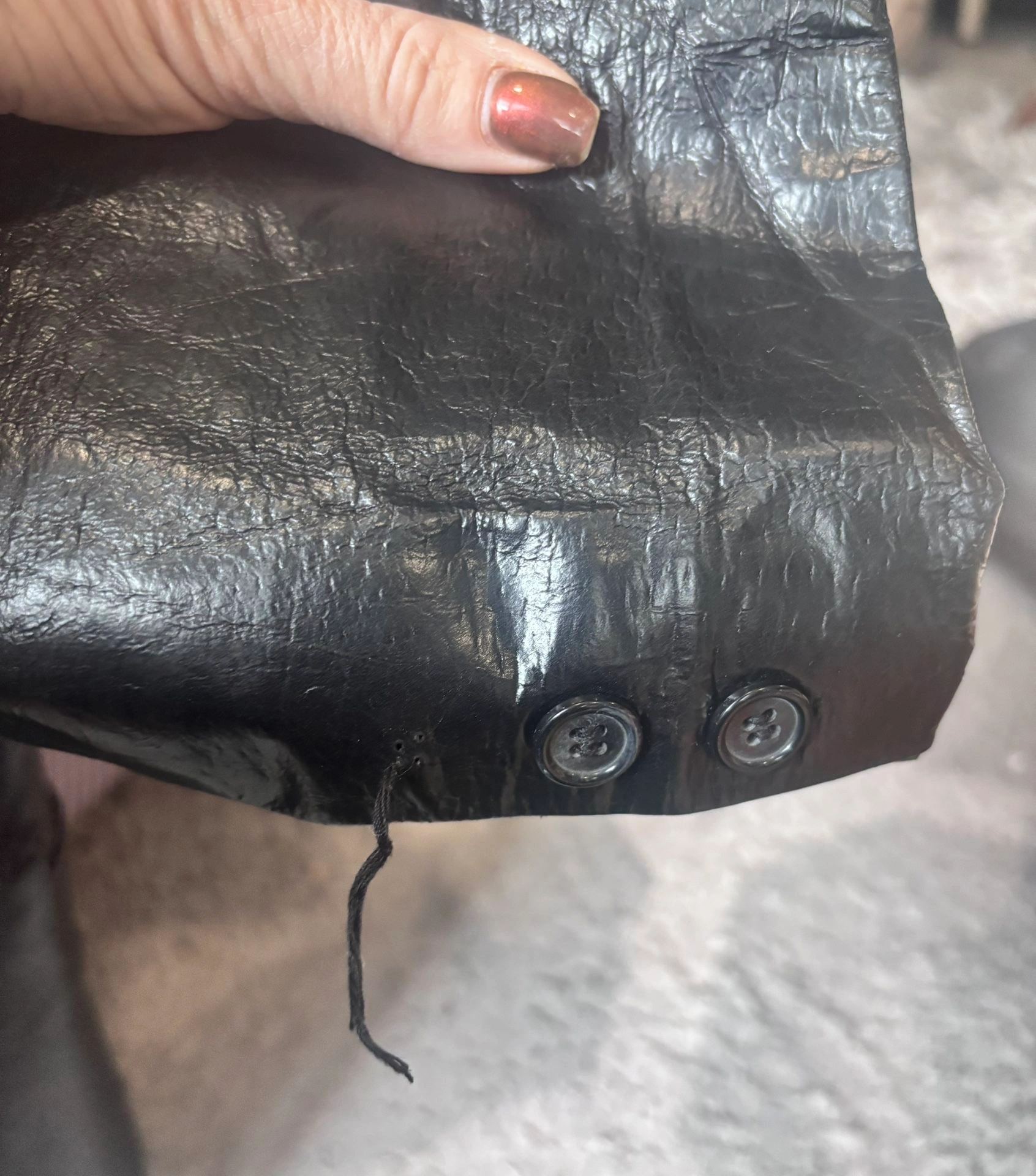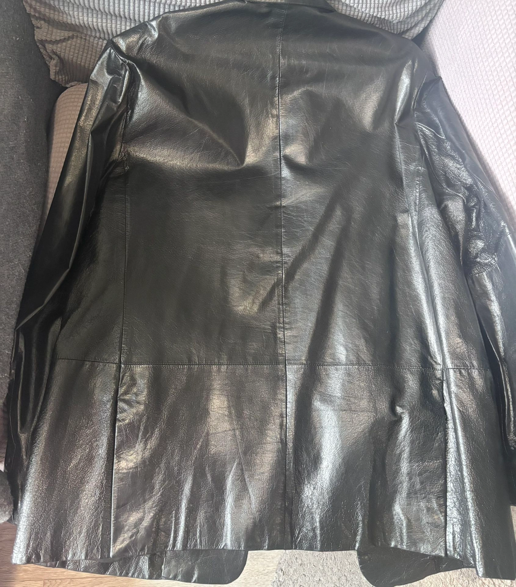 Classic vintage black leather jacket by Albert Duke New York, crafted from genuine leather with a timeless blazer-style silhouette. Features include a notched lapel and front button closure. The leather has natural creasing and texture consistent with age, giving this jacket an authentic vintage look and feel. A versatile outerwear piece that works well for casual, smart-casual, or layered fall and winter styling. Measurements (Laid Flat): Length: 31 inches (from top of shoulder to hem), Pit to Pit (Chest): 20 inches across, Approx. Chest: 40 inches around. Please compare measurements with a similar jacket you own for best fit. Vintage sizing may differ from modern sizes; this extra large may actually fit someone who is large instead. Two buttons are missing from each sleeve cuff (cosmetic only), and one of the buttons is a little loose. Does not affect wearability or structure. Otherwise excellent condition. Buttons can be replaced by a tailor if desired. Please review all photos carefully. Size: XL. Brand: Albert Dukes.