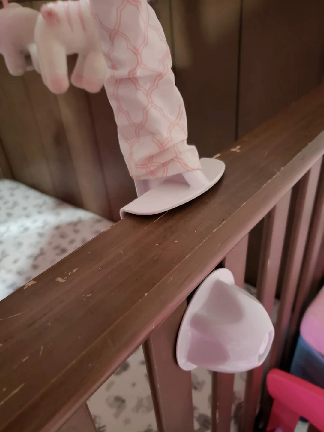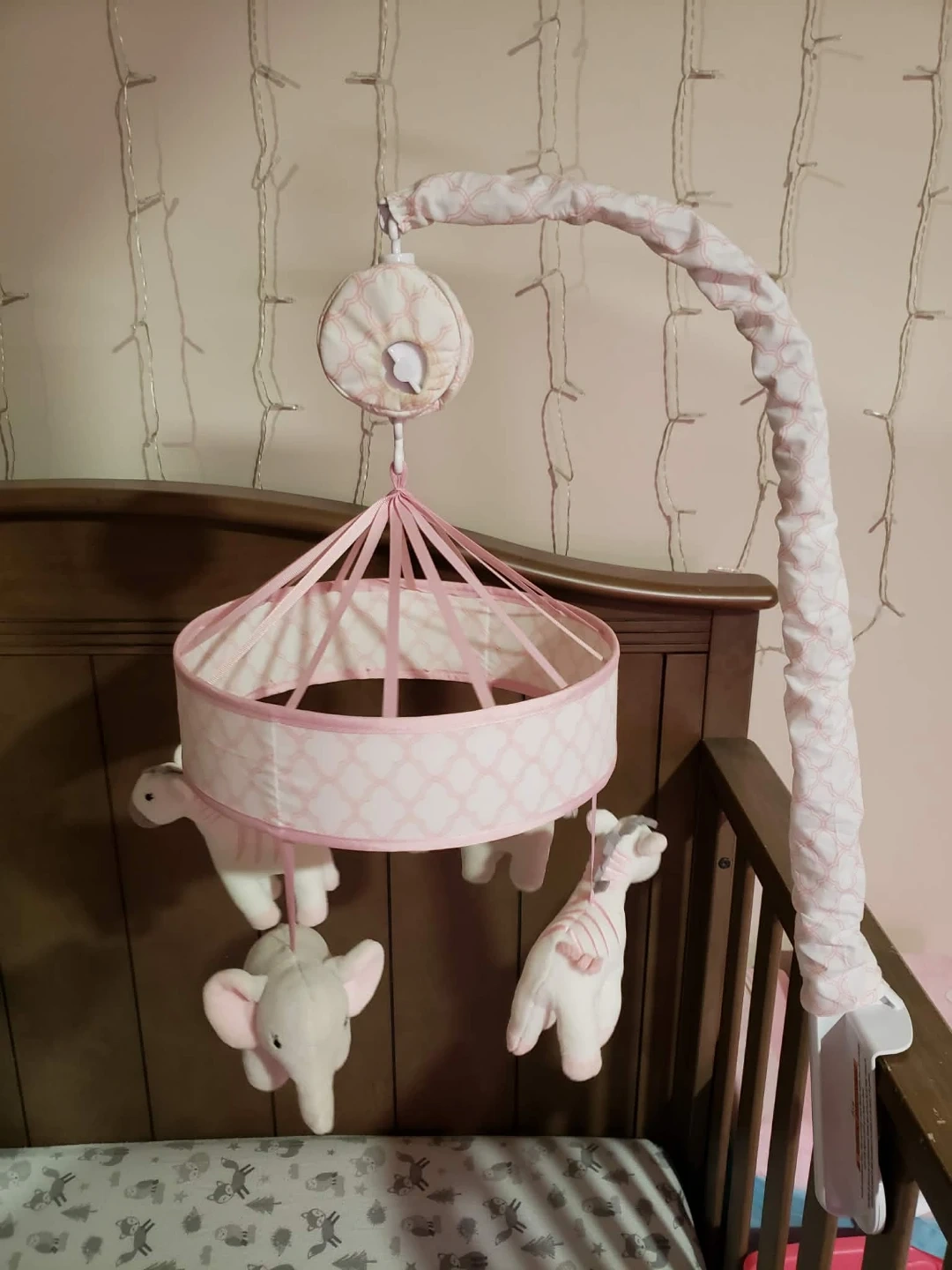This cute crib mobile features plush elephants and zebras. It attaches securely to the crib railing. Has a wind up piece in the top that plays music and spins the animals.