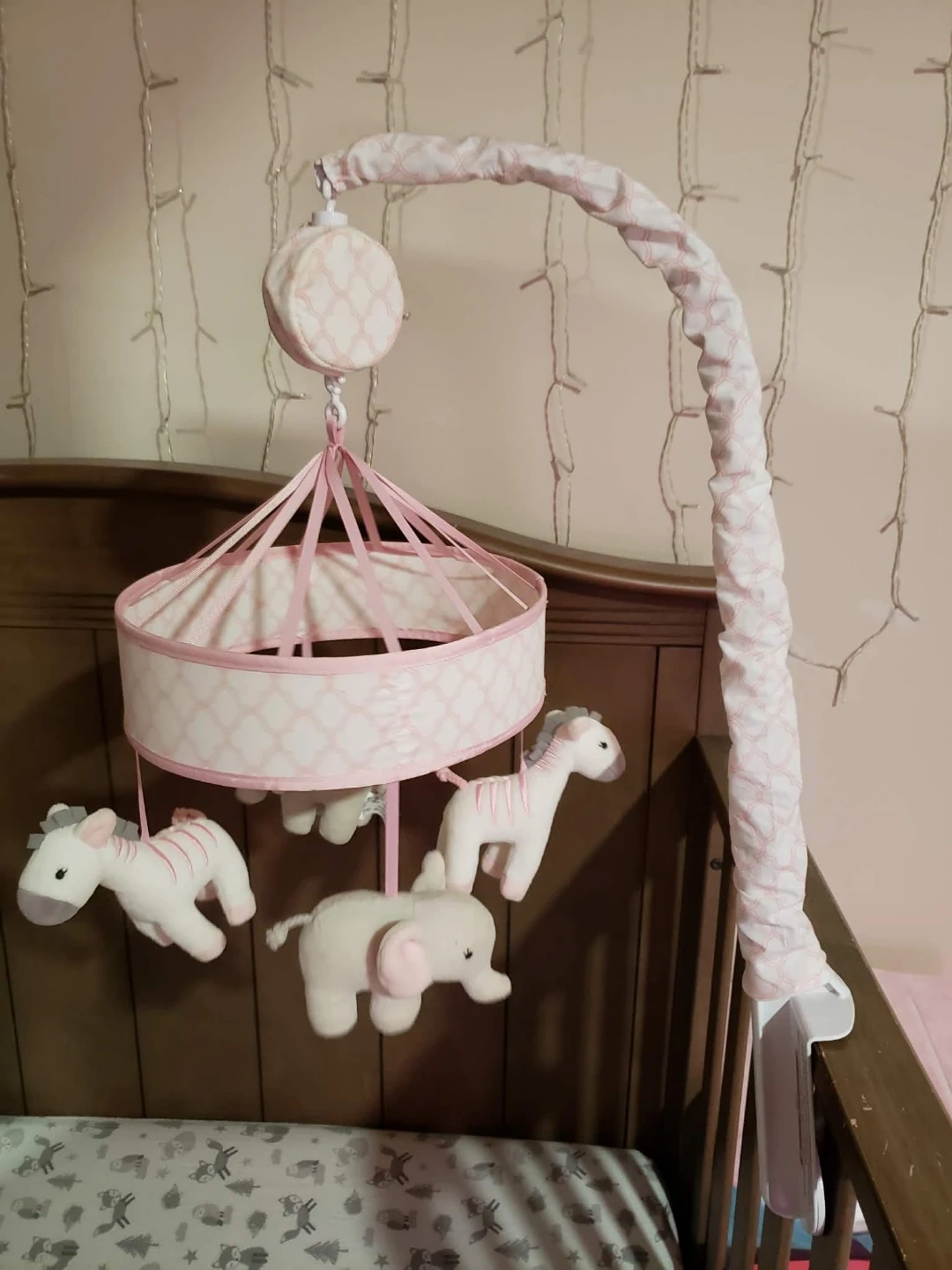 This cute crib mobile features plush elephants and zebras. It attaches securely to the crib railing. Has a wind up piece in the top that plays music and spins the animals.